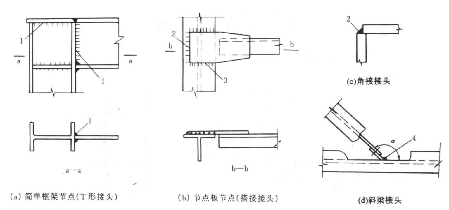 图 3.2-4 角焊缝1—T型接头角焊缝;2—端角焊缝;3—侧角焊缝;4—斜角焊缝