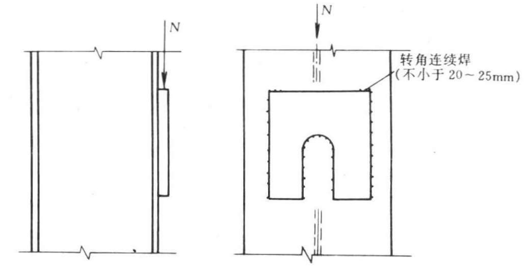 当受力较大并当 b 亦较大不能满足以上要求时,可采用(图3.2-8)所示的托板焊接传力构造。