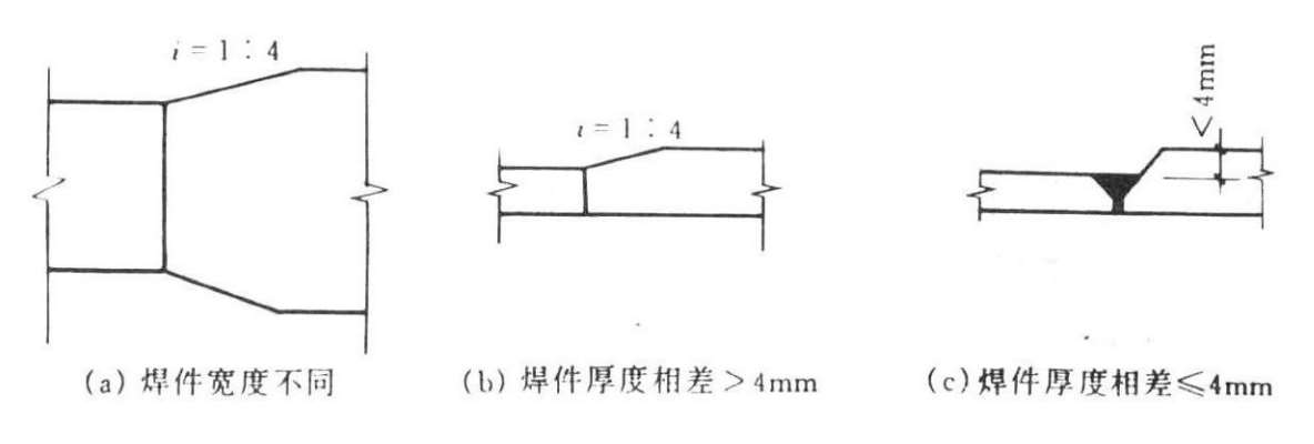 6.在对接焊缝的连接处,当焊件的宽度不同或厚度相差超过4 mm时,应分别在宽度方向或厚度方向从一侧或两侧作成坡度不大于1/4的斜角(图3.2-7),厚度不同处对接焊缝的坡口型式应根据较薄焊件厚度确定。