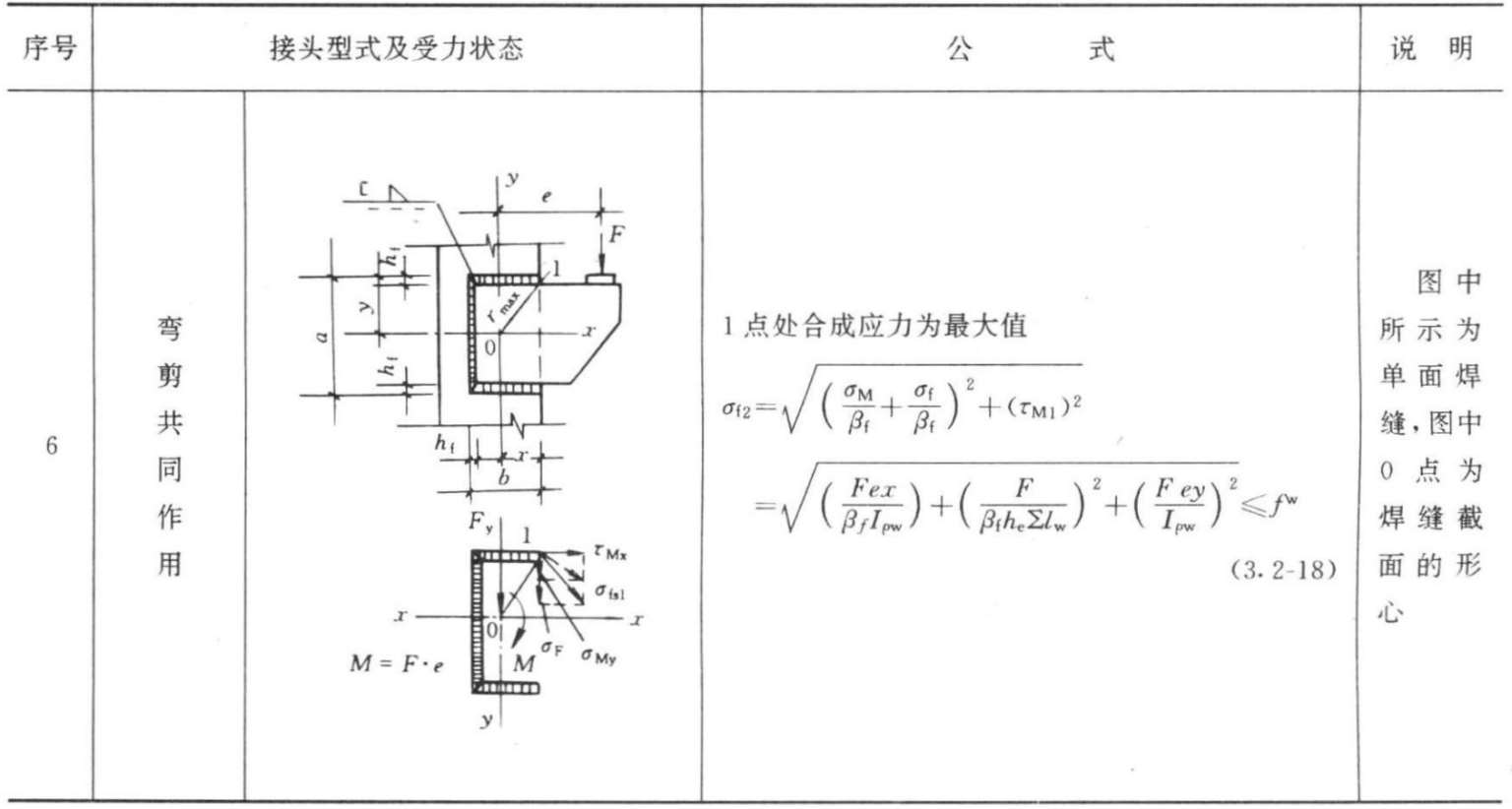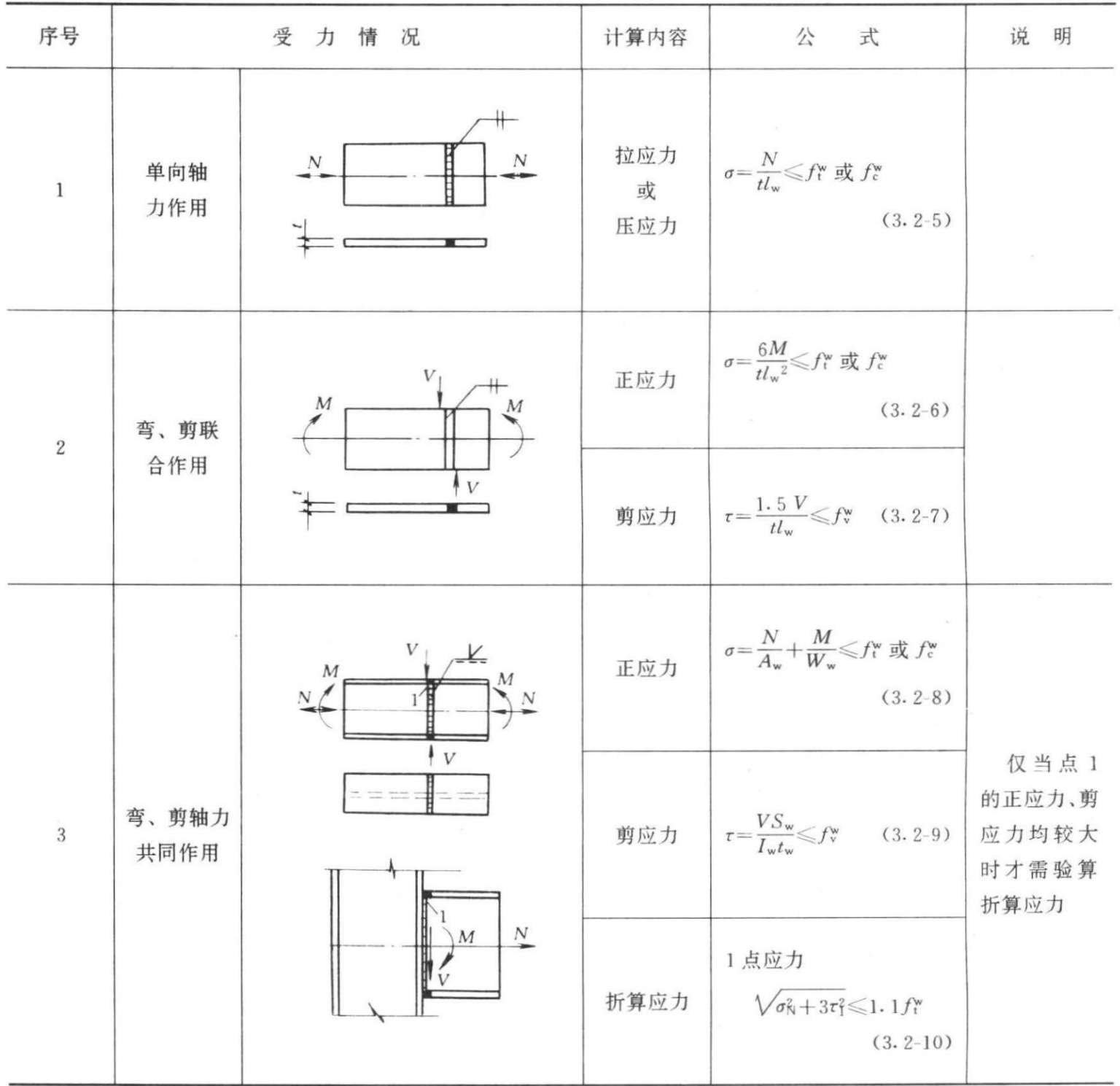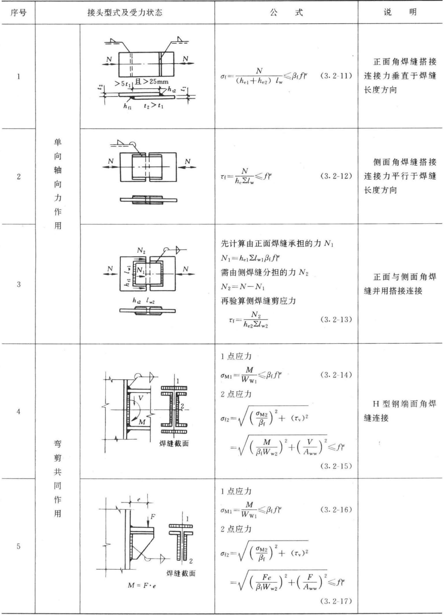 进行焊接连接的强度计算时,一般采用应力表达式,各类焊接连接的焊缝应力强度计算公式可按表3.2-6、3.2-7中各式采用。