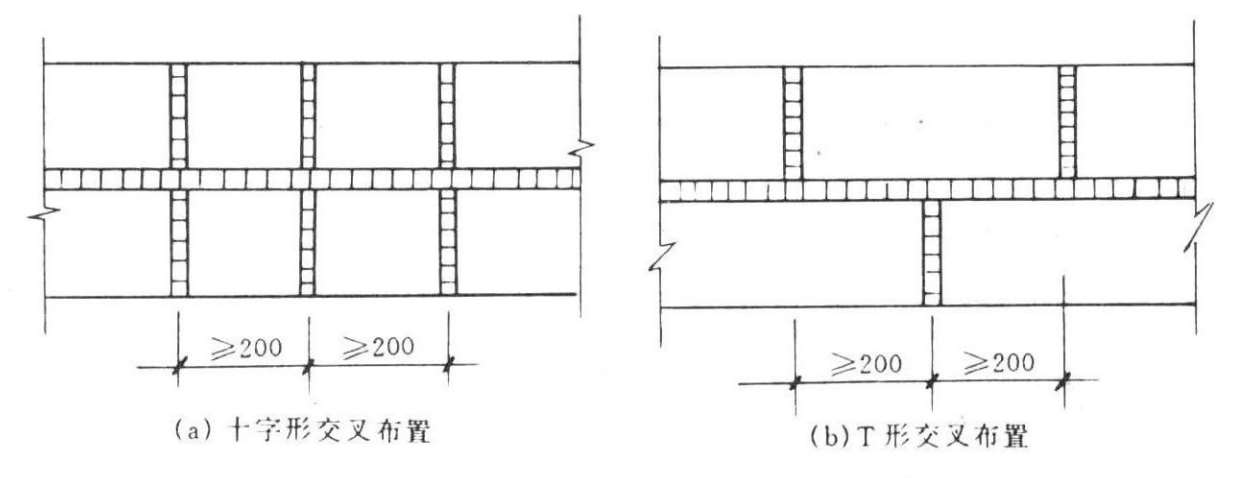 5.采用对接焊缝的板材拼接中,其纵横两方向的对接焊缝宜采用十字型交叉布置,也可采用T型交叉布置,交叉点的间距不得小于200 mm(图 3.2-6)。