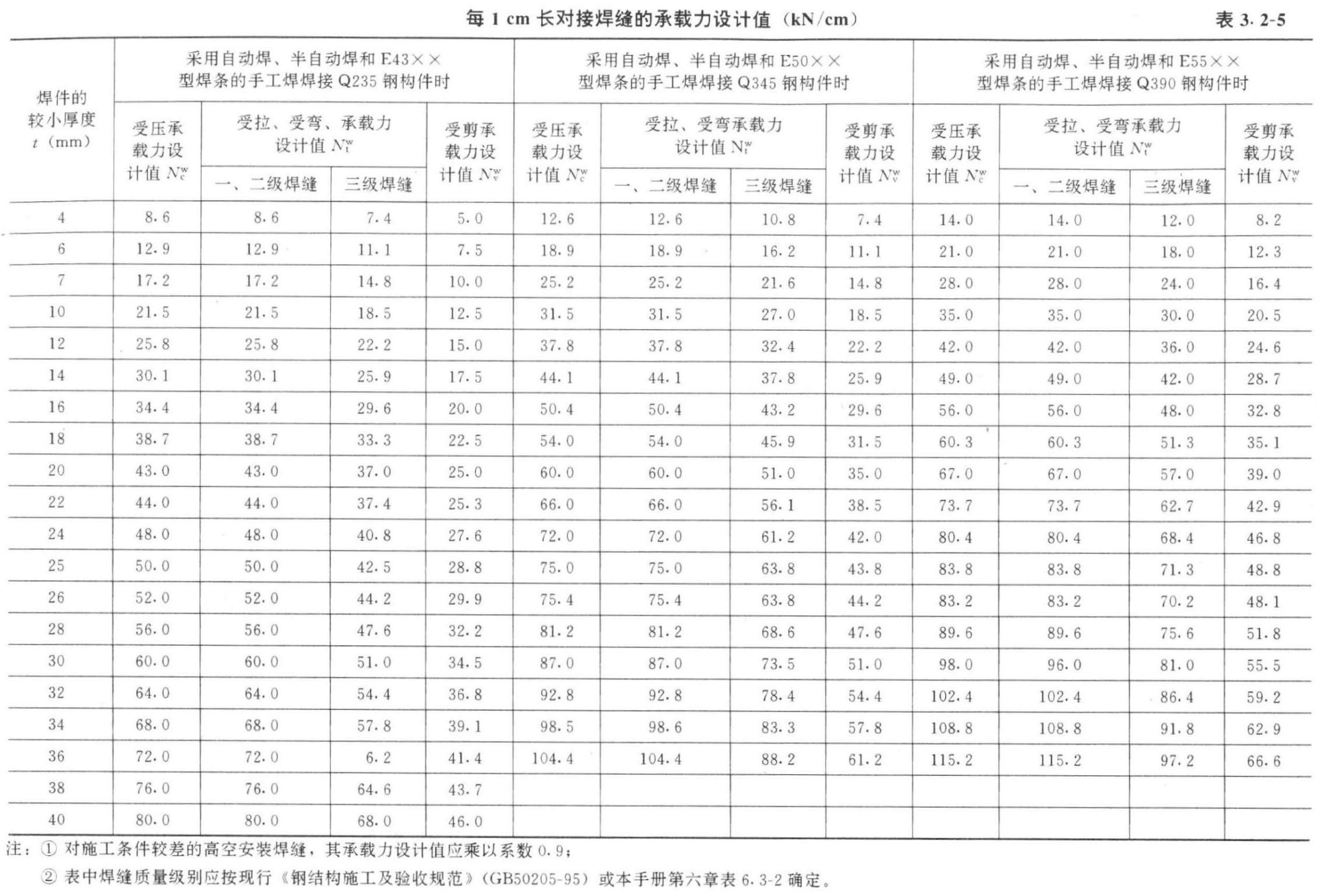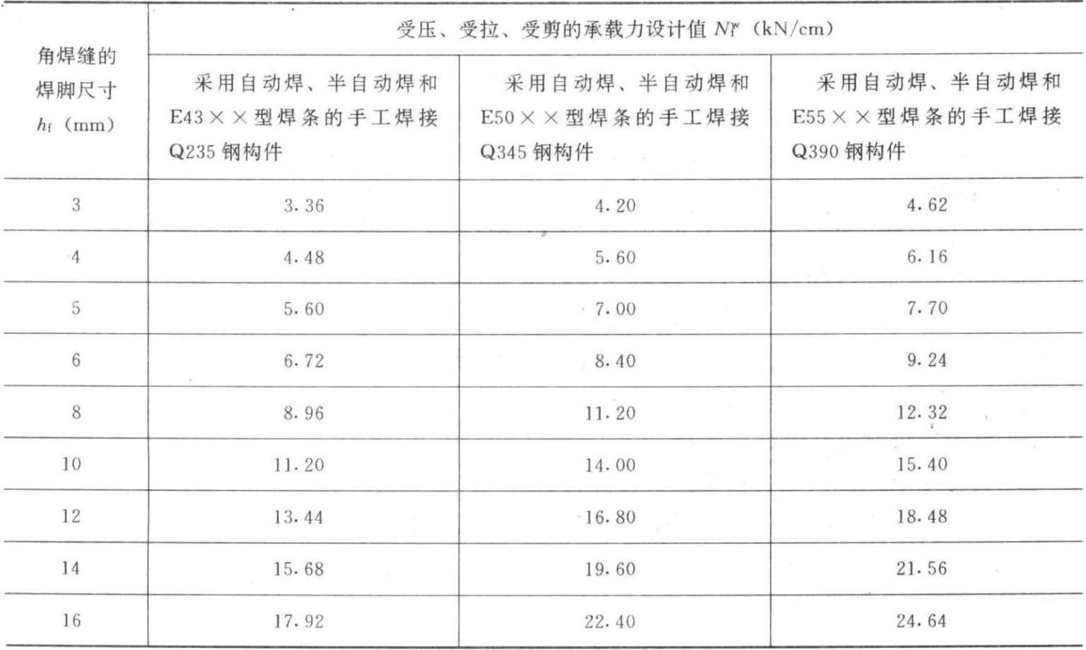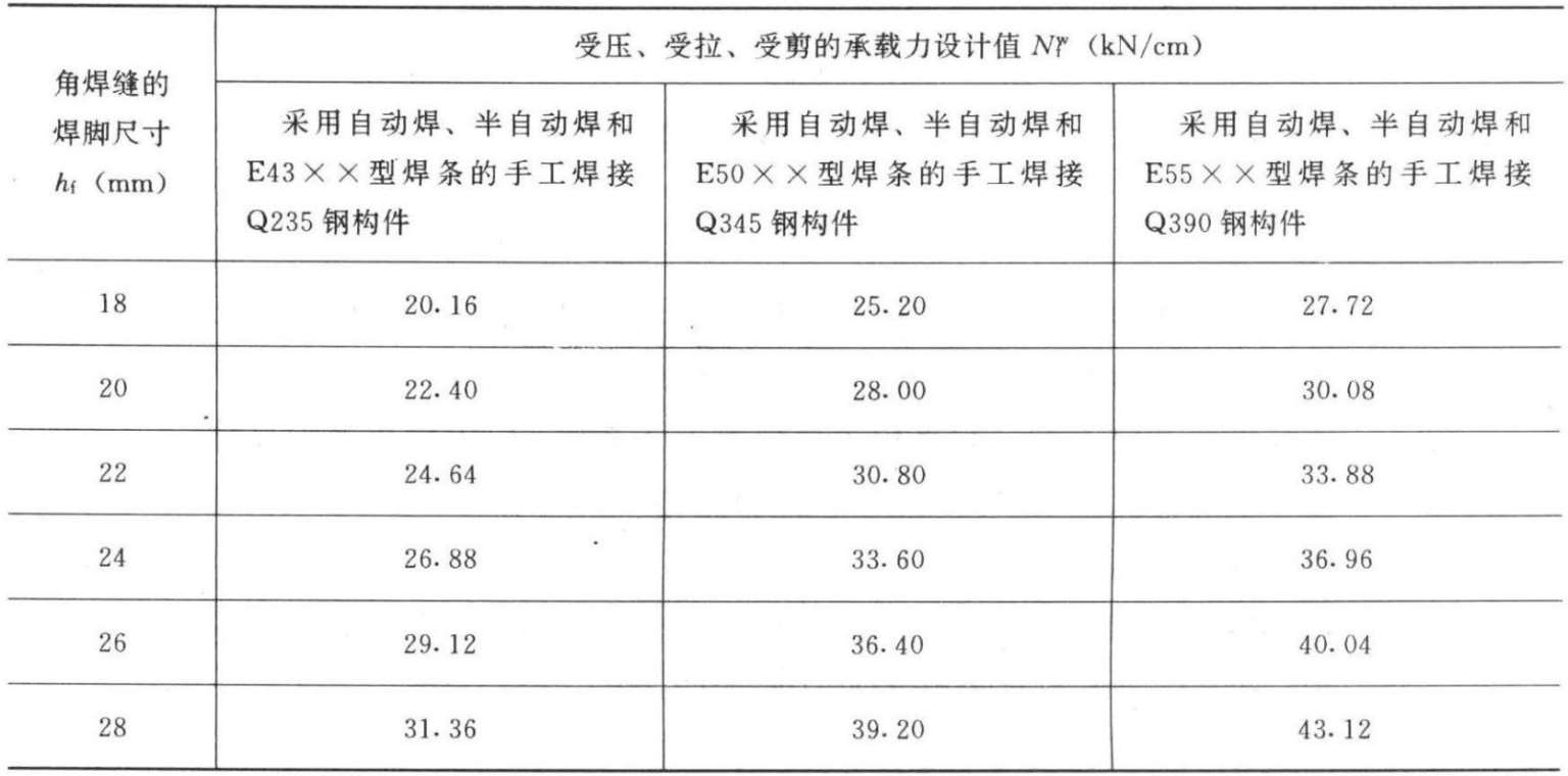 为方便运算,单位长度焊缝的承载力(设计值)亦可按表3.2-4、3.2-5直接查用。