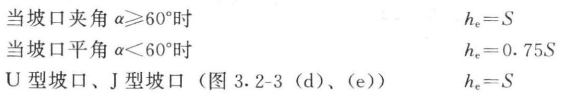 S 为坡口根部至焊缝表面(不考虑余高)的最短距离,同时 h e 取值尚应满足下式要求: