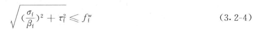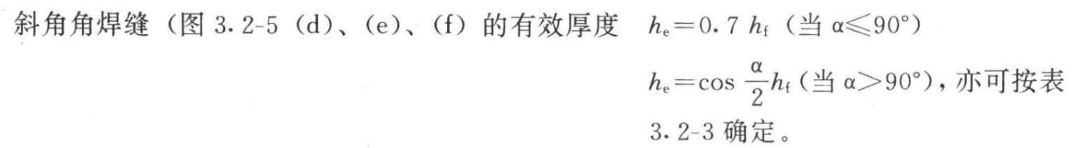 斜角角焊缝(图 3.2-5(d)、(e)、(f))的强度按公式(3.2-2)、(3.2-3)、(3.2-4)计算,但取 β f =1.0 ,其有效厚度按表3.2-3 确定。