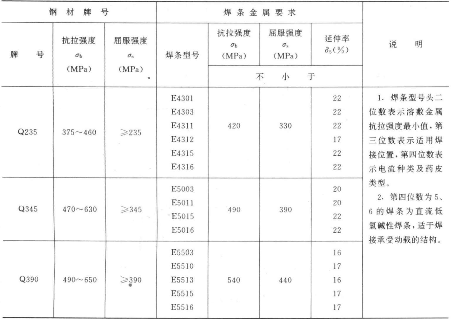 1.焊缝金属的性能应与焊件金属母材相适应,当两种不同强度的钢材焊接时,宜采用与低强度钢材相适应的焊接材料。