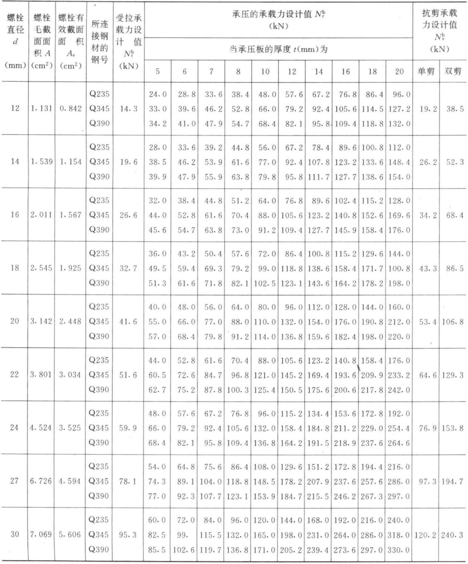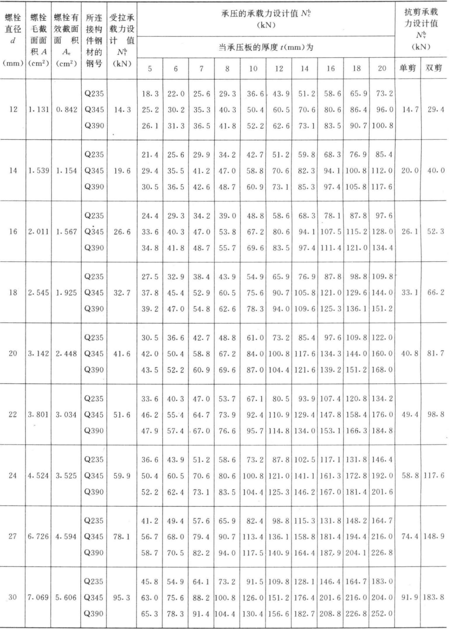 一个A(B)级螺栓的承载力(设计值) 表3.3-5