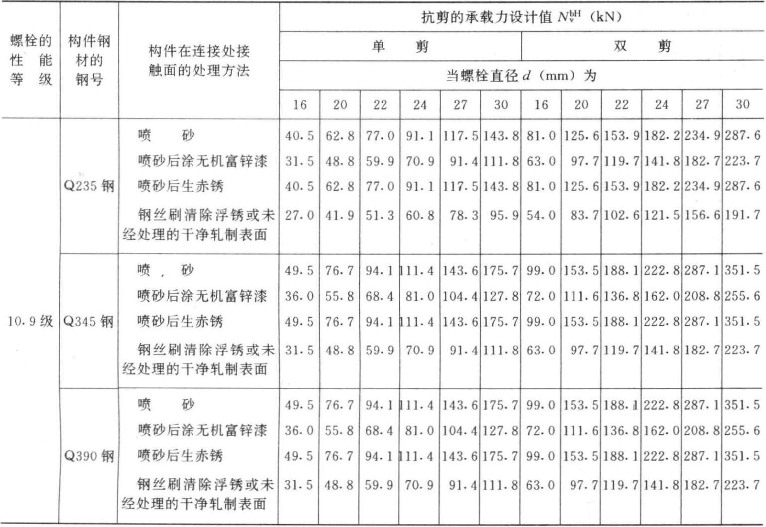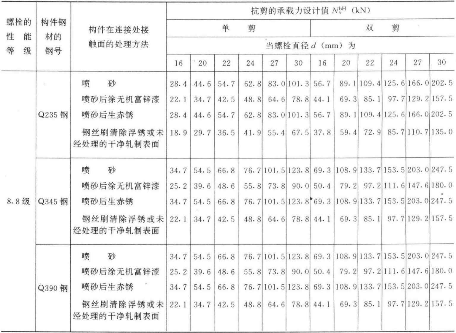 注:①表中高强度螺栓受剪的承载力设计值按下式算得:
