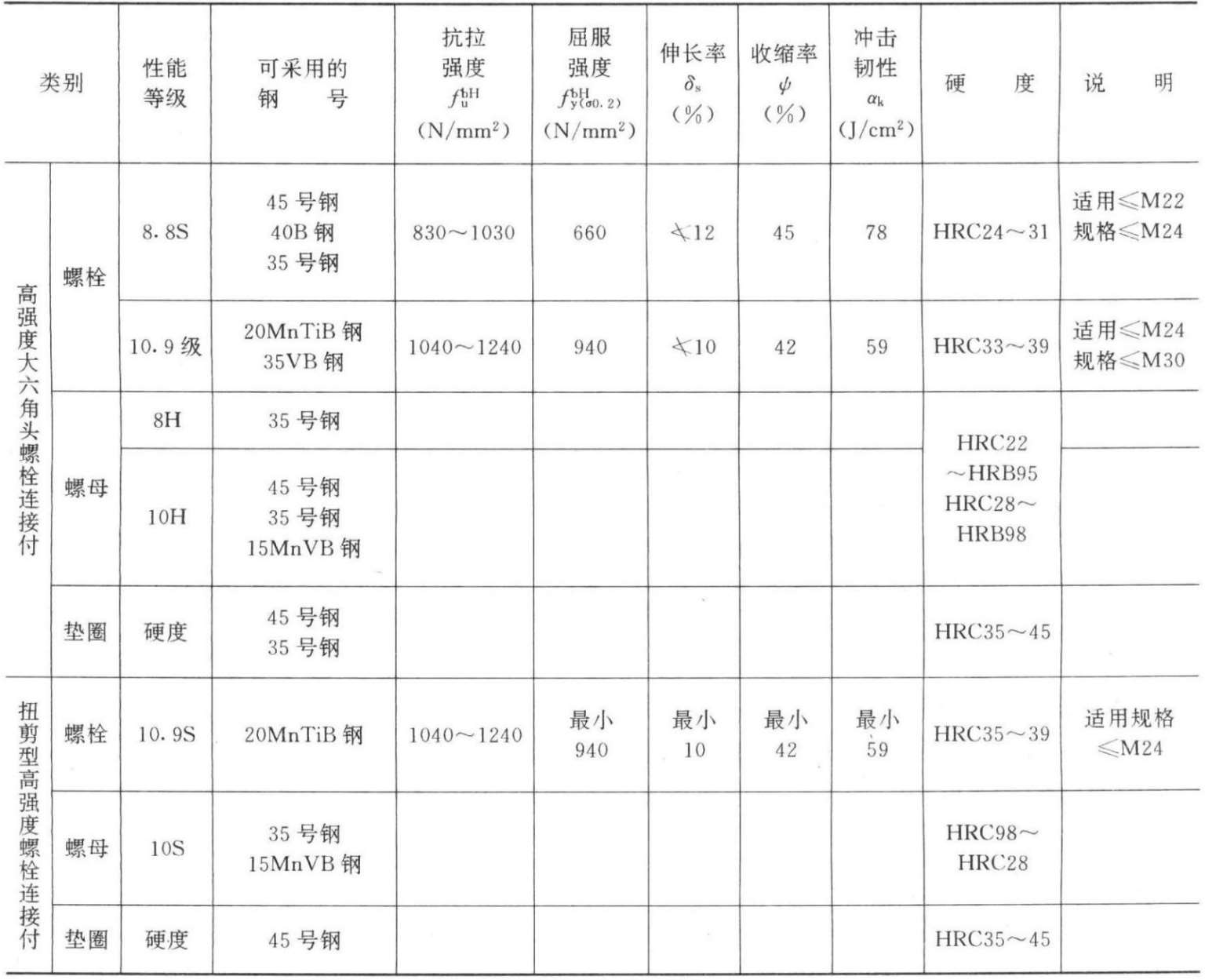 高强度螺栓、螺母、垫圈经热处理后的机械性能 表3.3-8