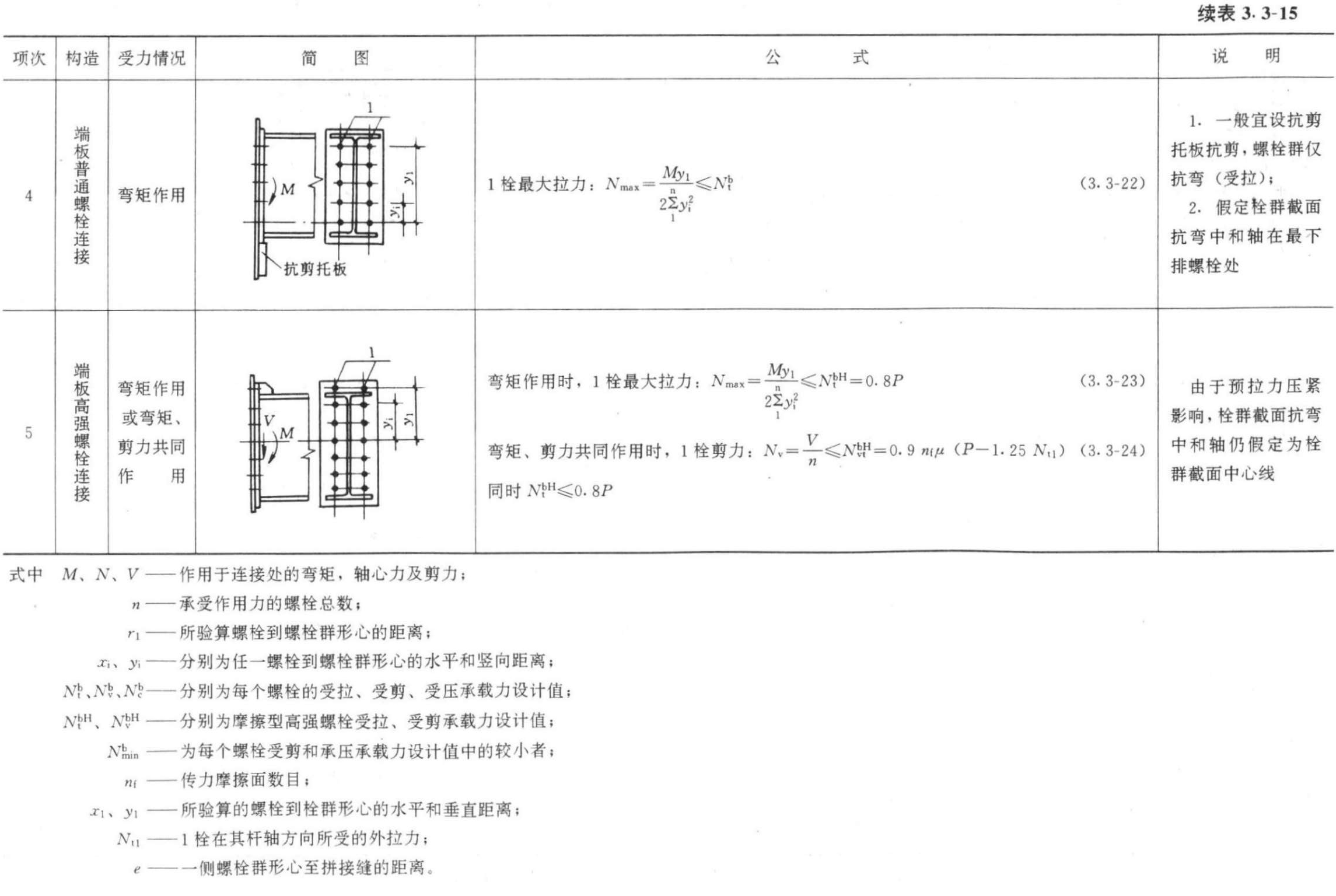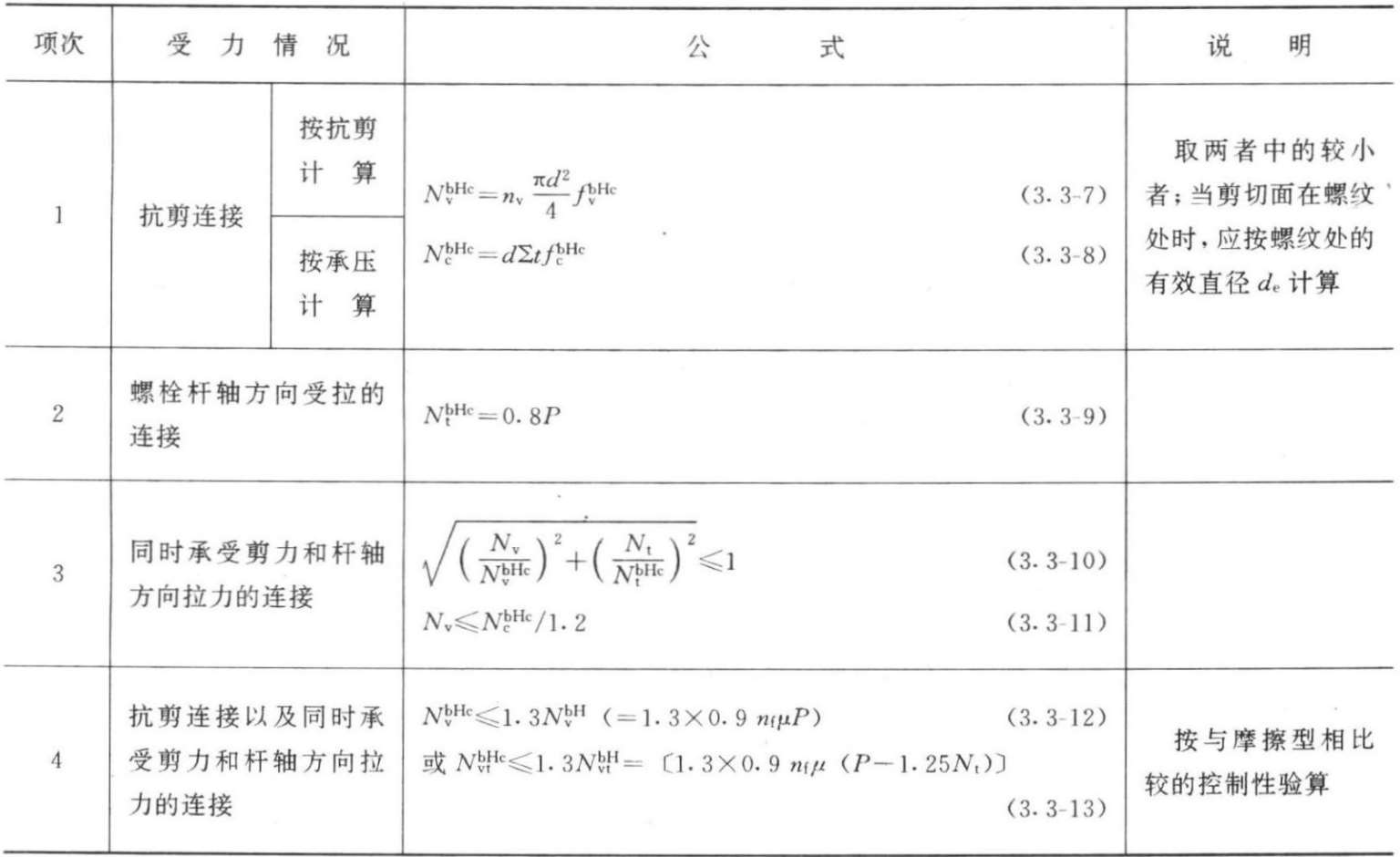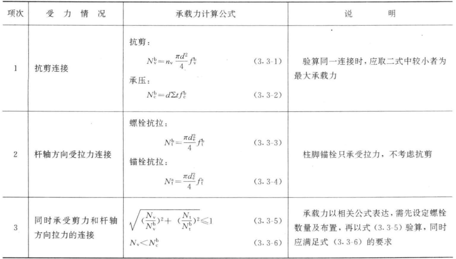 1.普通螺栓按其构造不同(图3.3-1)可分别按单剪、双剪、承压或受拉以及拉剪共同作用等状态计算其承载力,对同一连接节点,应以同时具有几种承载力中的最小承载力为控制值进行连接设计,有关承载力计算公式及每个螺栓承载力(设计值)可分别见表3.3-4~3.3-6。