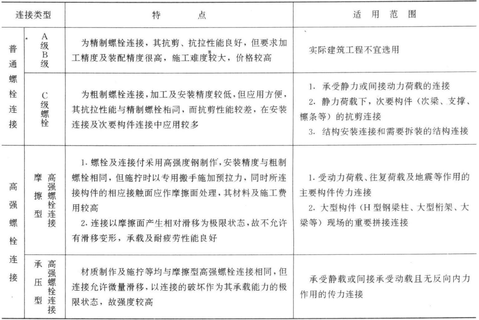 各类螺栓连接的特性及适用范围可见表3.3-1。