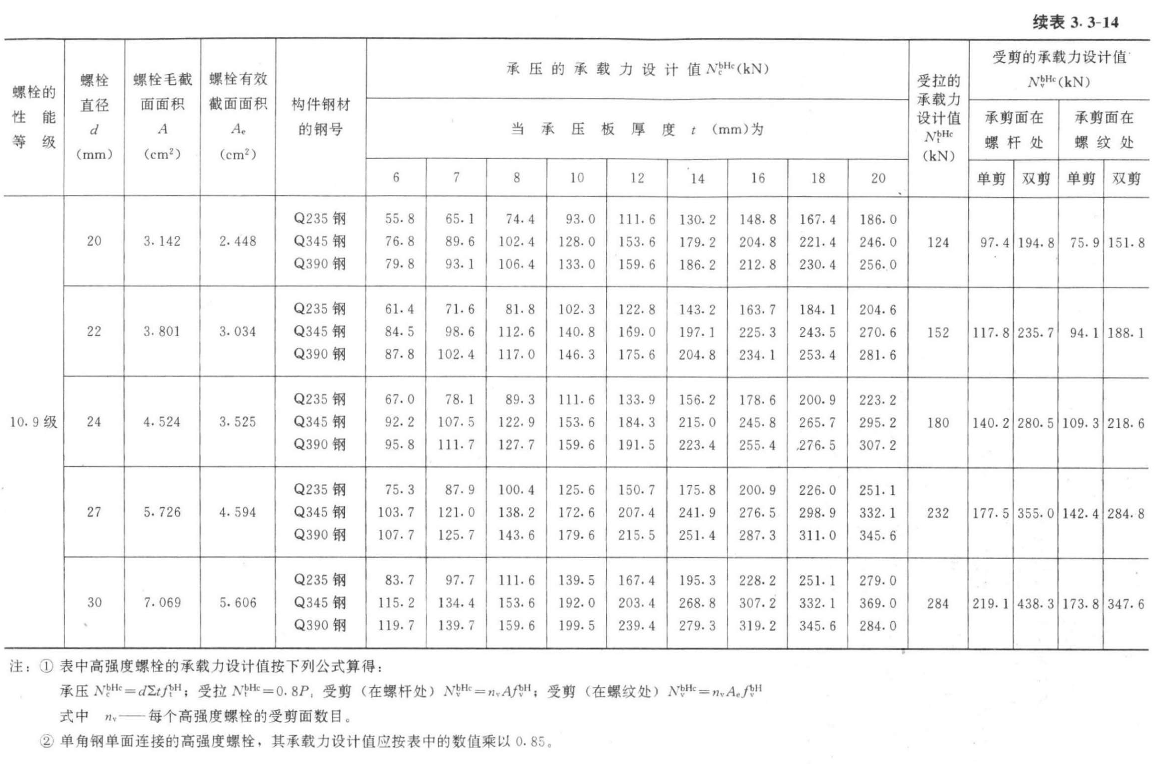 承压型连接中每个高强度螺栓的承载力(设计值)计算公式 表3.3-9