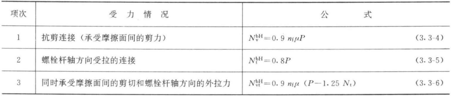 摩擦型连接中每个高强度螺栓的承载力(设计值)计算公式 表3.3-10
