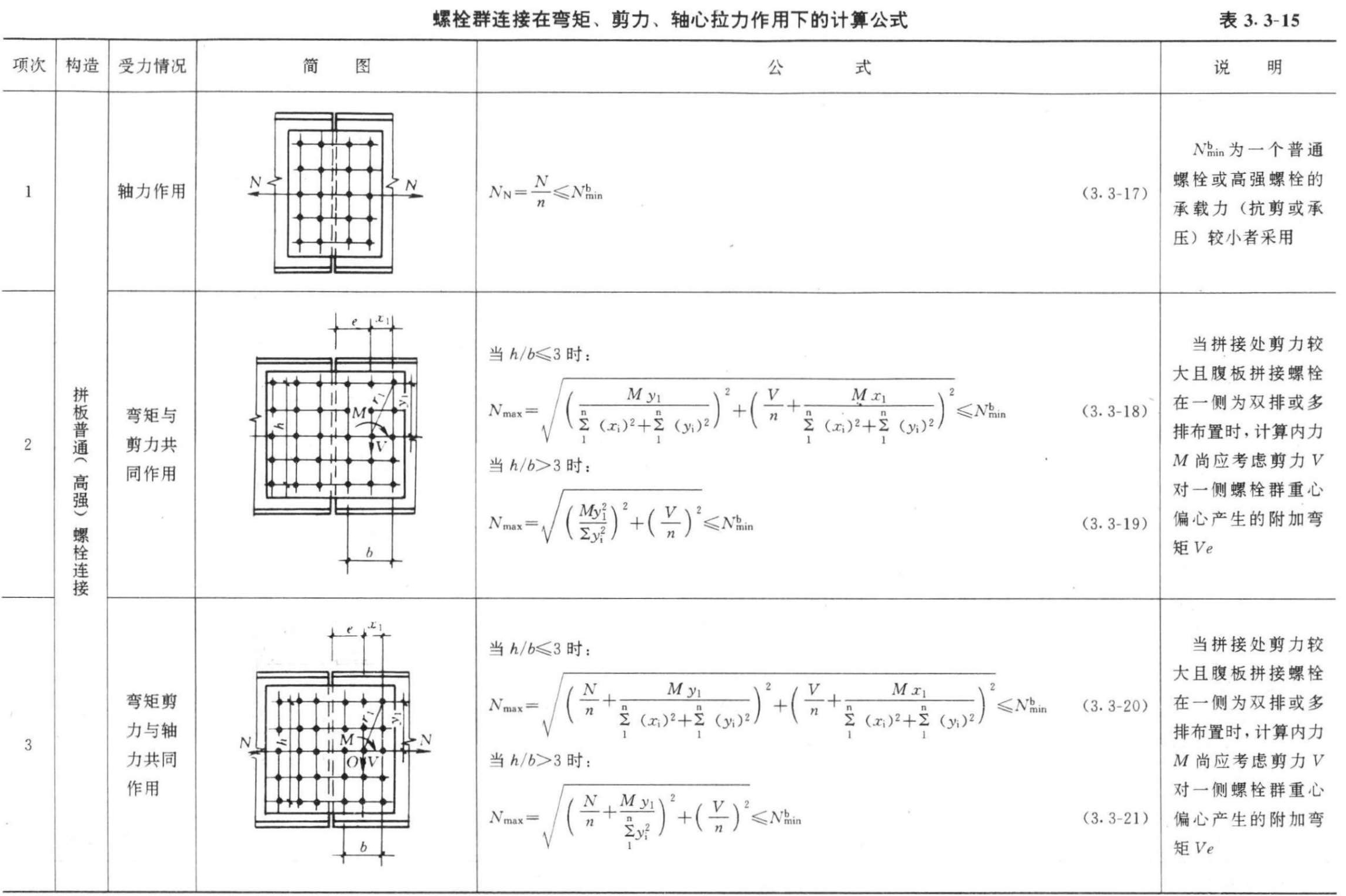 在实际工程中,螺栓连接大都以栓群连接为常用构造,如拼接及常用节点连接等,当承受轴力或剪力时,栓群按所有螺栓平均承担计算,当承受弯矩作用时,其承载力则以端部或角部受力最大的螺栓进行控制性验算。常用的栓群验算公式可按表3.3-15 采用。