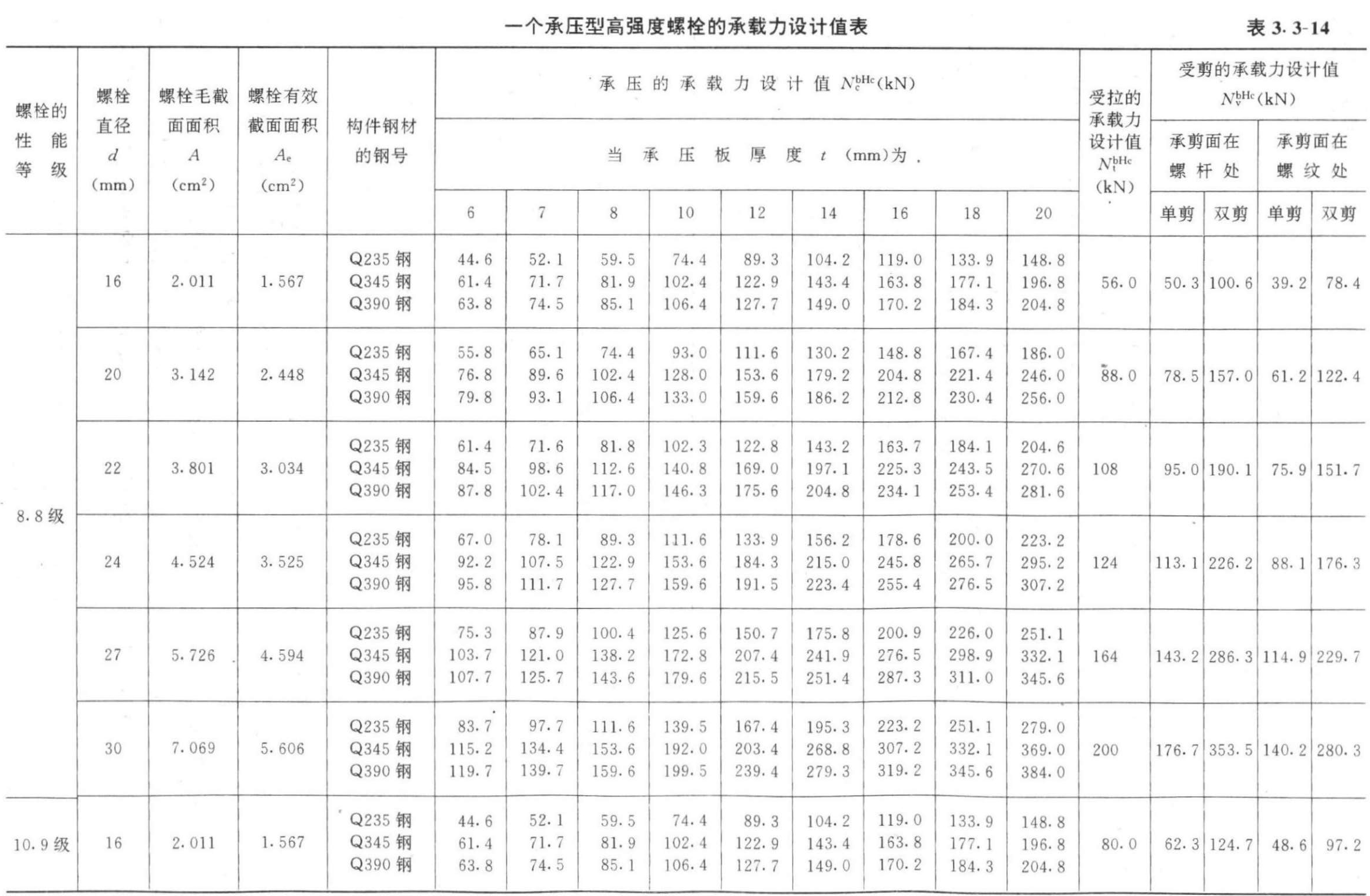 2.高强度螺栓的承载力表。按上述各式计算的摩擦型连接中一个高强螺栓的承载力值及承压型连接中一个高强螺栓的承载力值可分别由表3.3-13、表3.3-14查得。