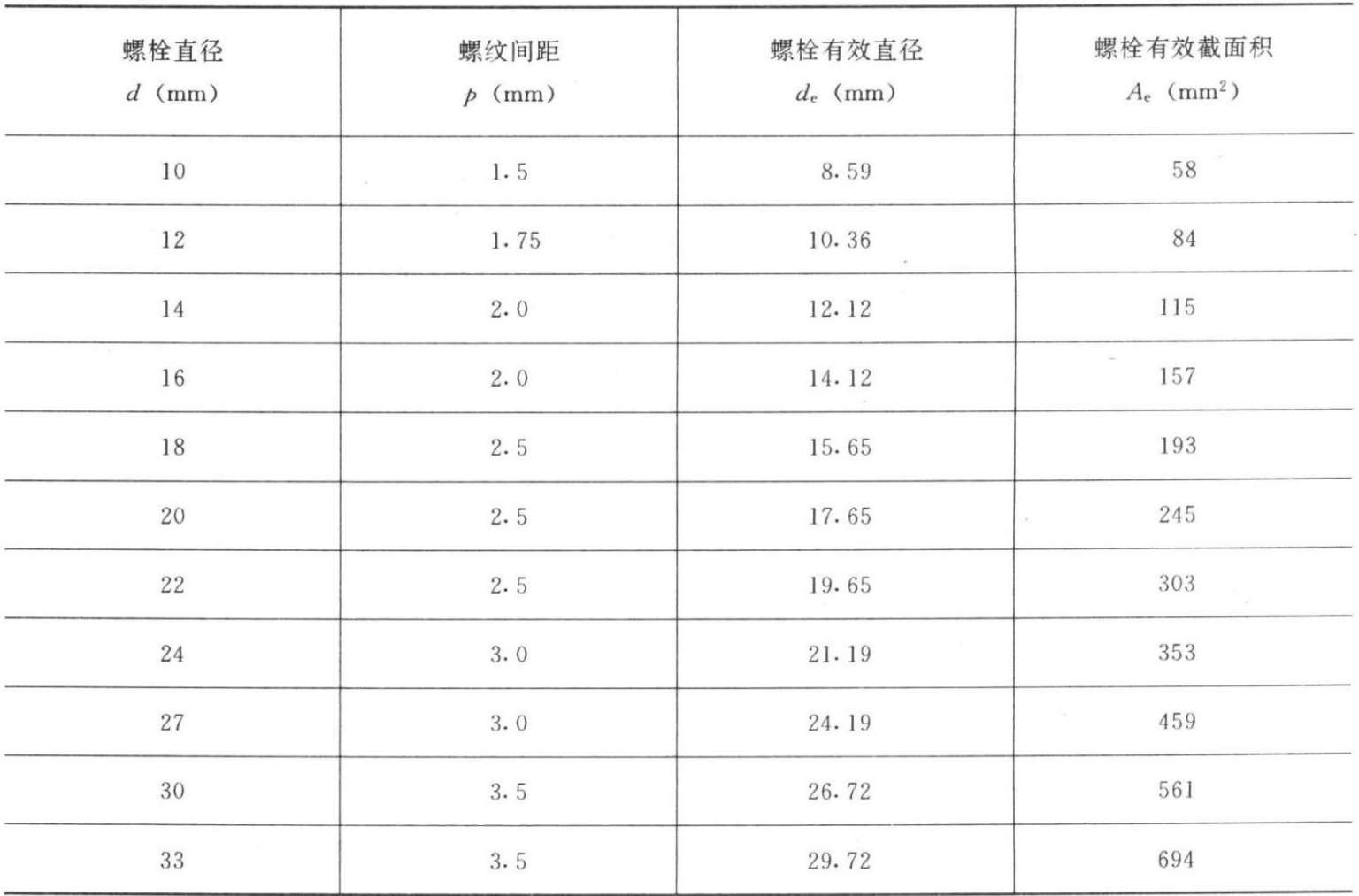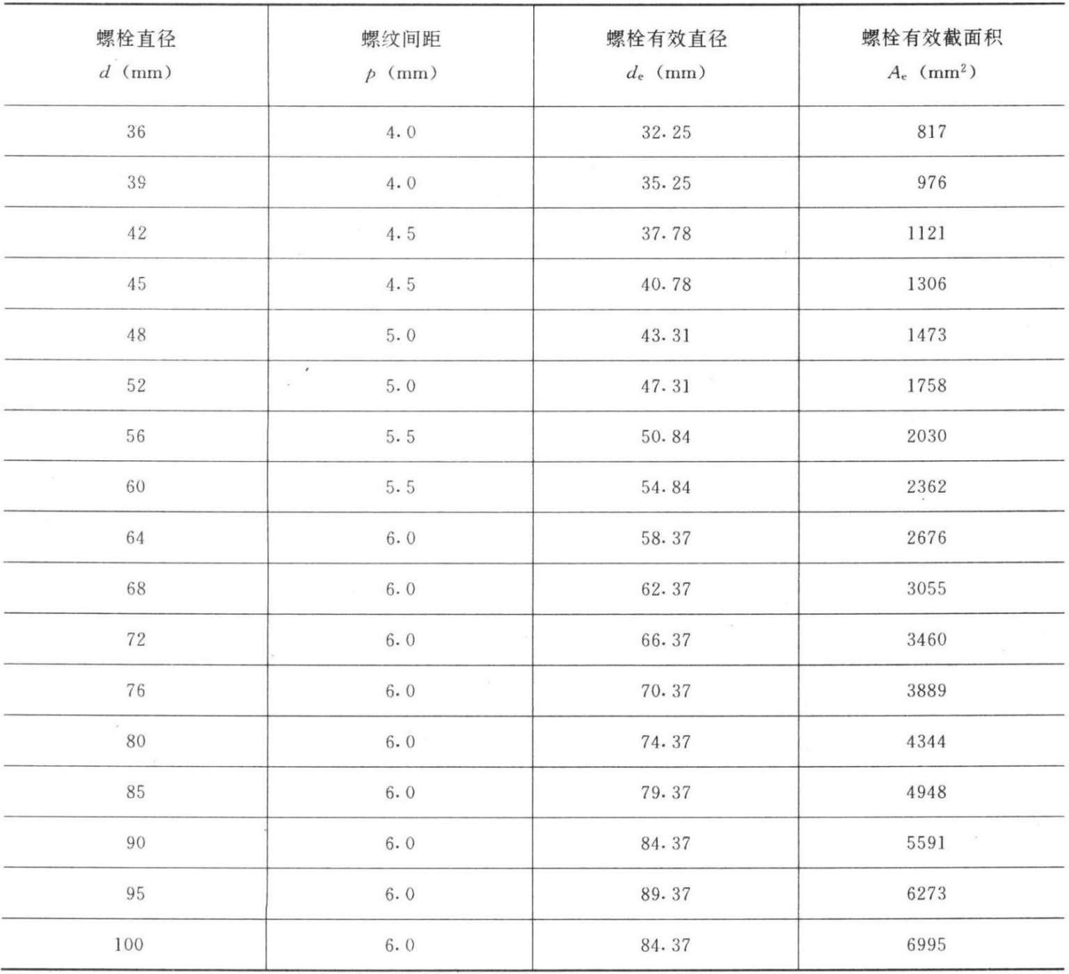 注:表中螺栓在螺纹处的有效直径