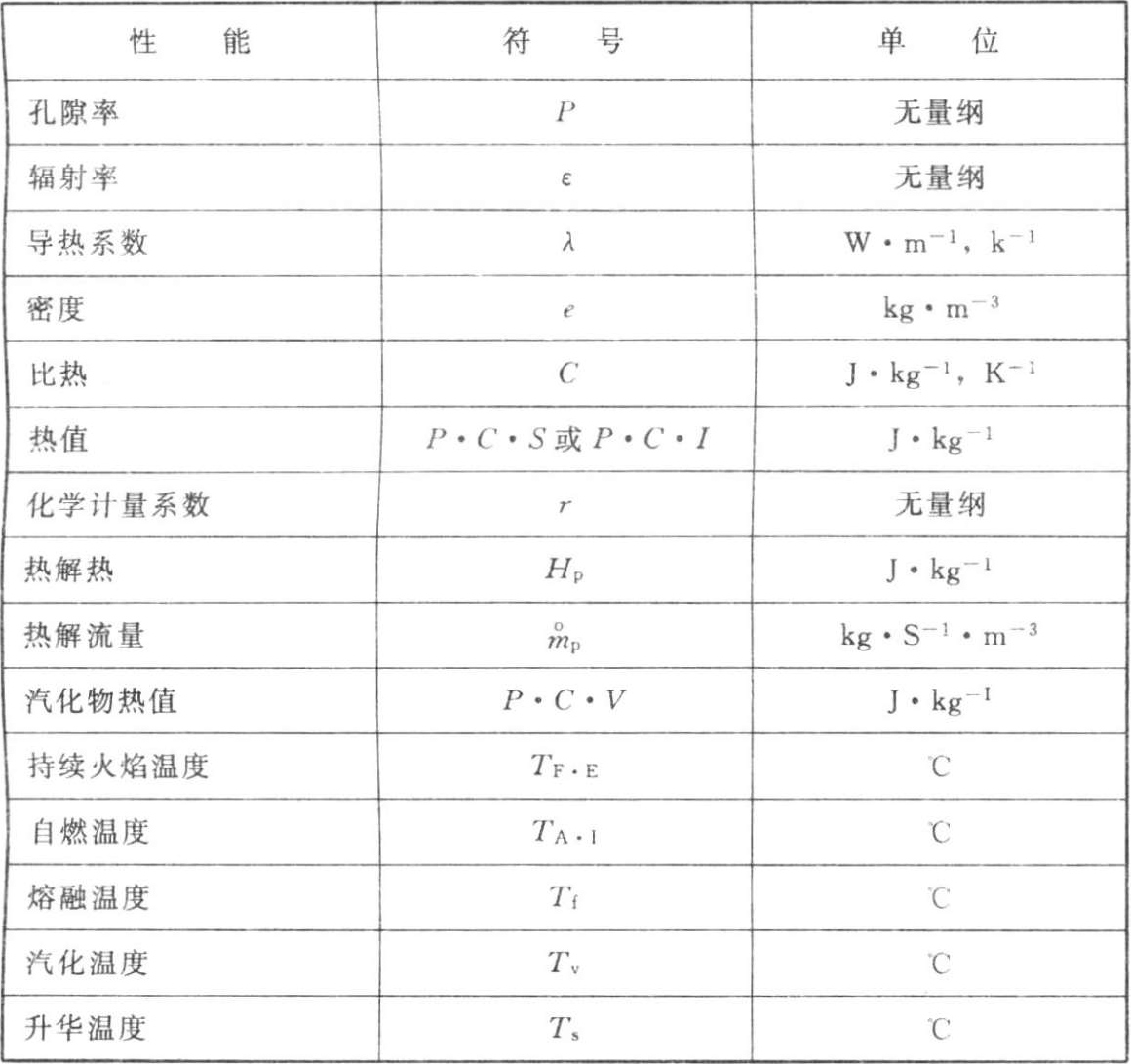 综上所述,根据材料与火的点燃、蔓延和轰燃有关的材料基本性能概括列在表2-1中。
