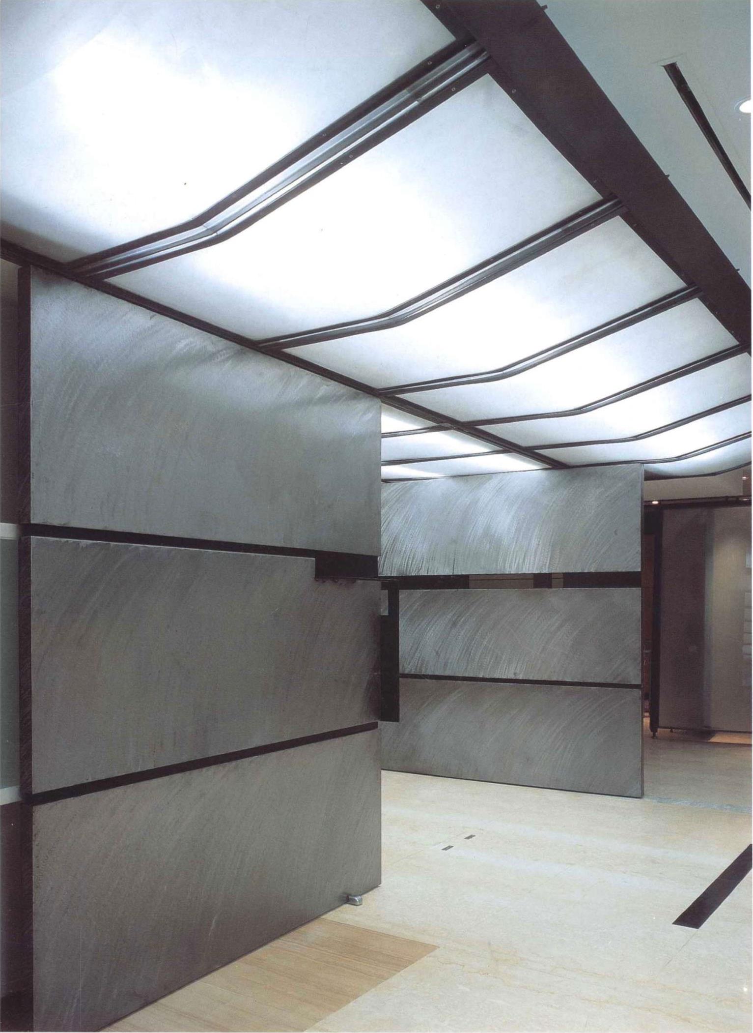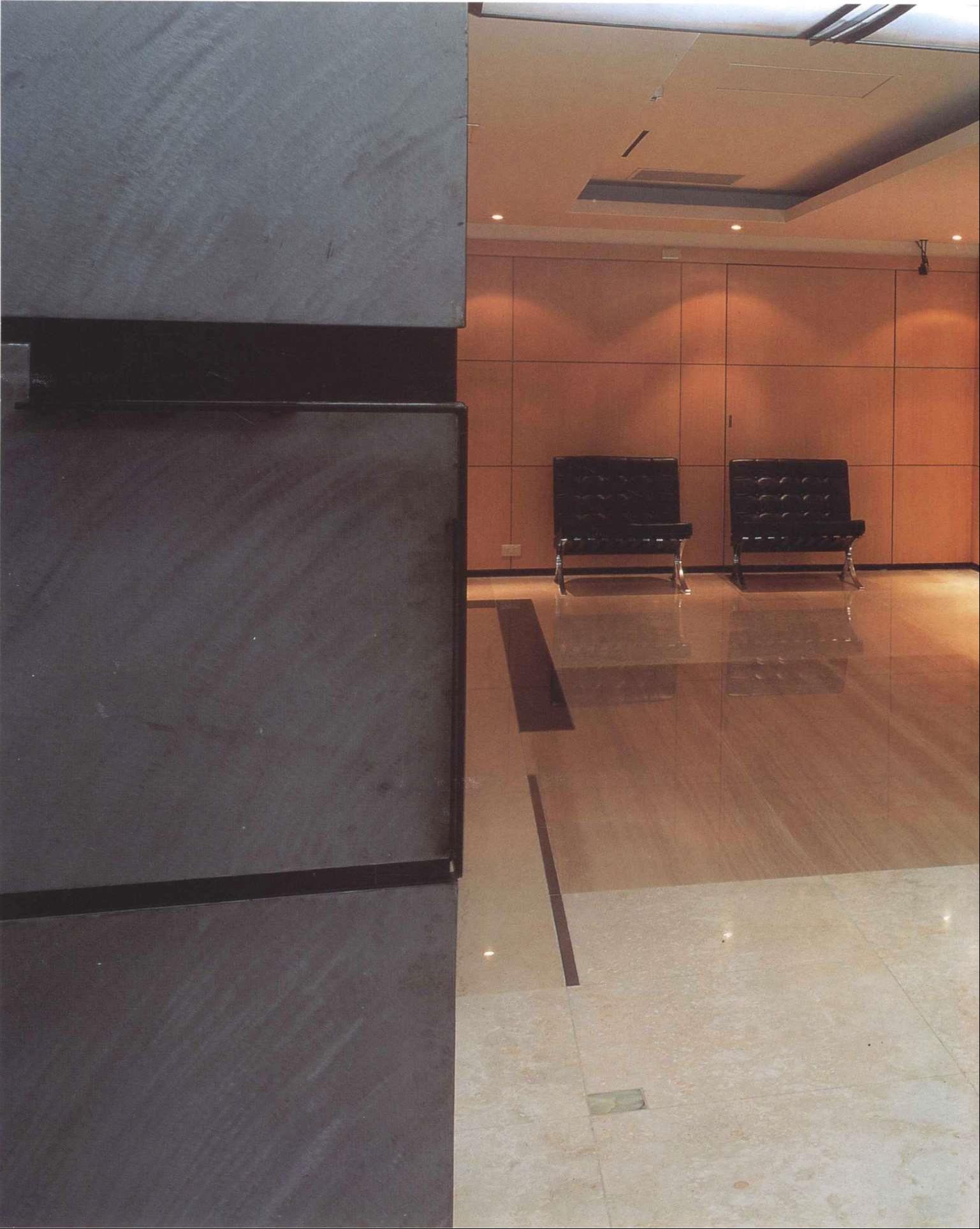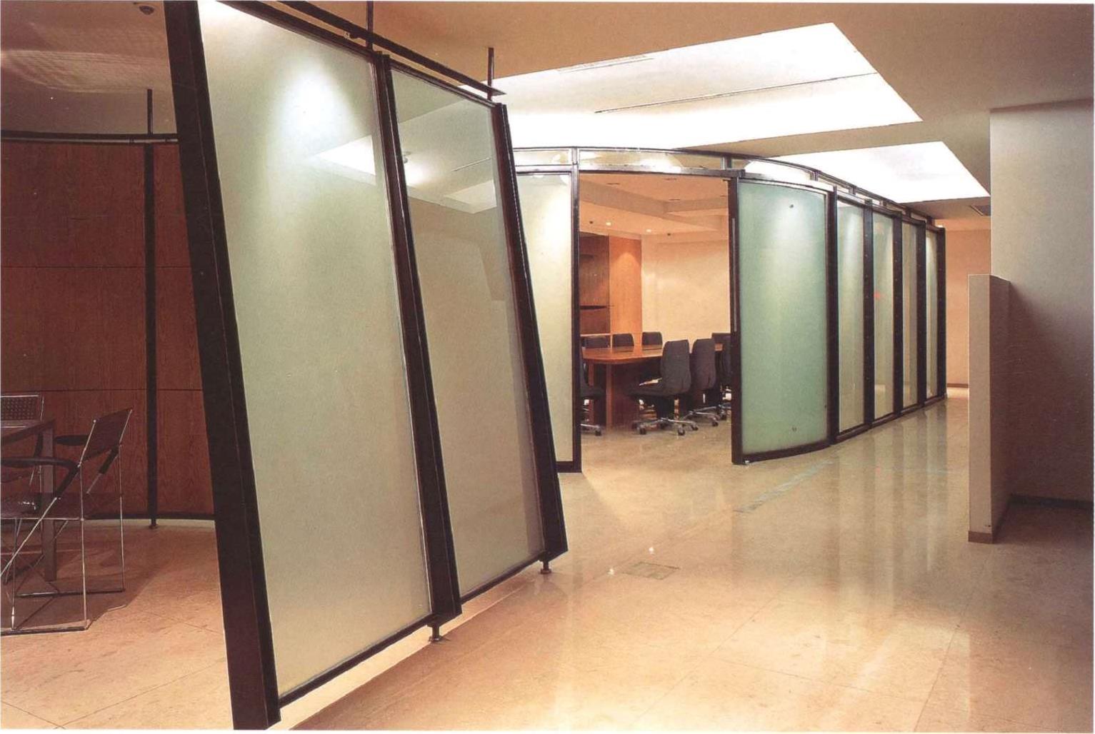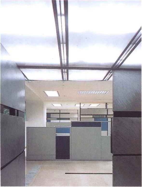 此道隔墙的设置除了因应实质功能的考量之外,还具有另一层意义,其部分由喷砂玻璃所形成的半透明墙面,就像一面面的投影荧幕,而影象的来源则来自隔墙外的周边工作区,此区工作人员的身影借由外墙窗面所引进的天花板,投影在半透明的玻璃隔墙上,成为一幕幕生动、有如幻象般的画面。