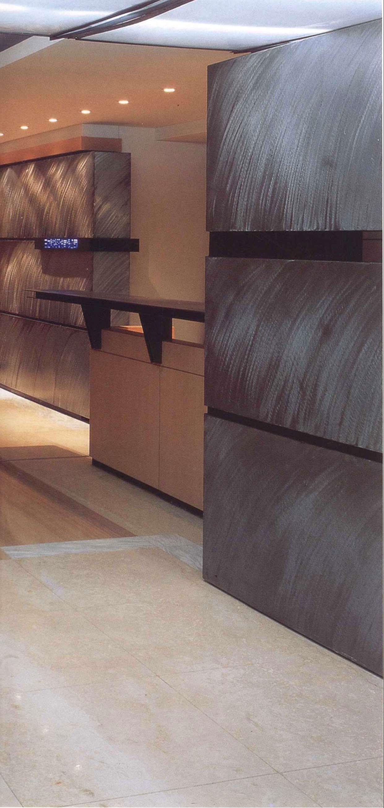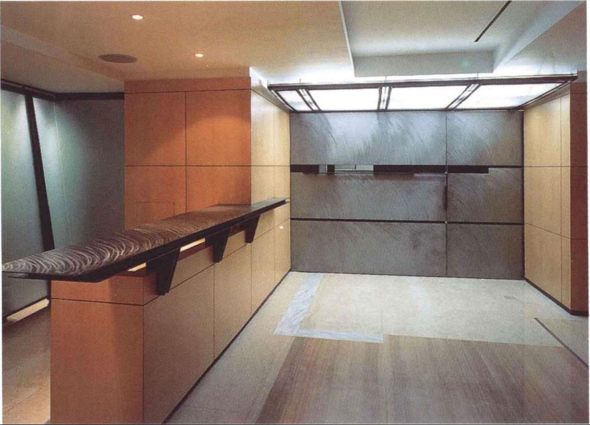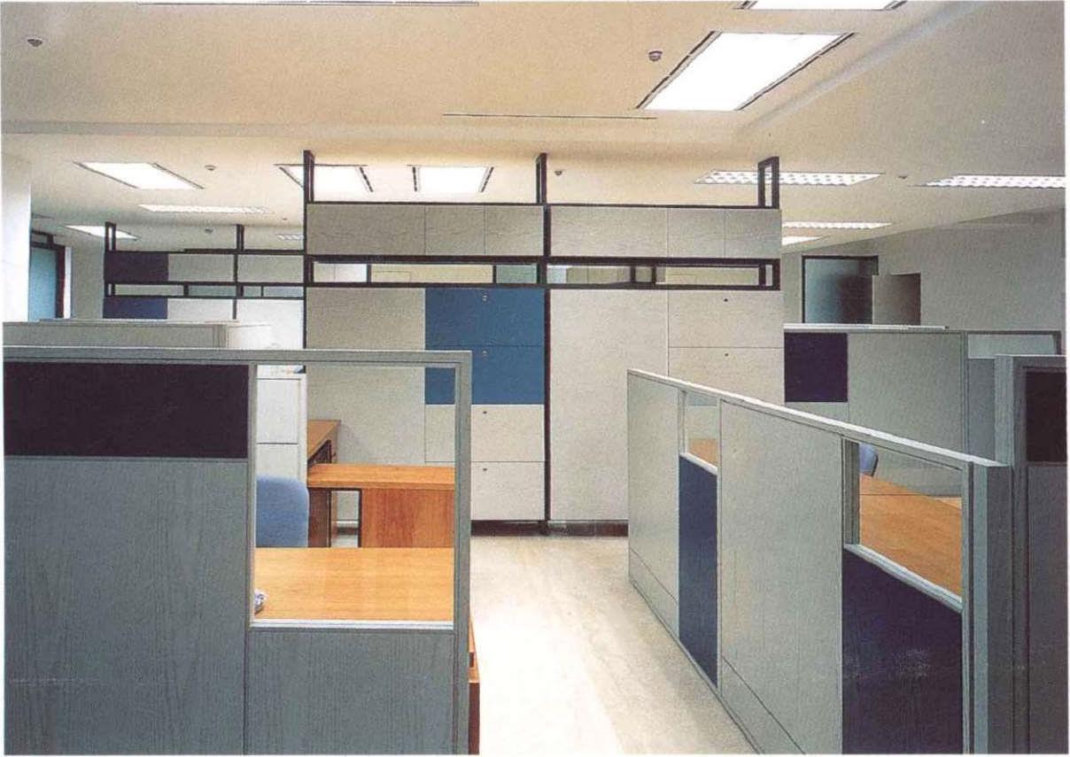 此道隔墙的设置除了因应实质功能的考量之外,还具有另一层意义,其部分由喷砂玻璃所形成的半透明墙面,就像一面面的投影荧幕,而影象的来源则来自隔墙外的周边工作区,此区工作人员的身影借由外墙窗面所引进的天花板,投影在半透明的玻璃隔墙上,成为一幕幕生动、有如幻象般的画面。