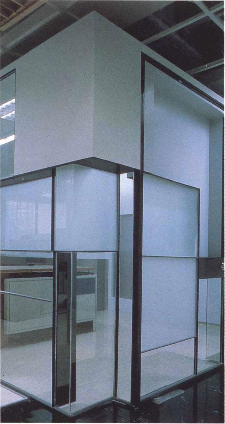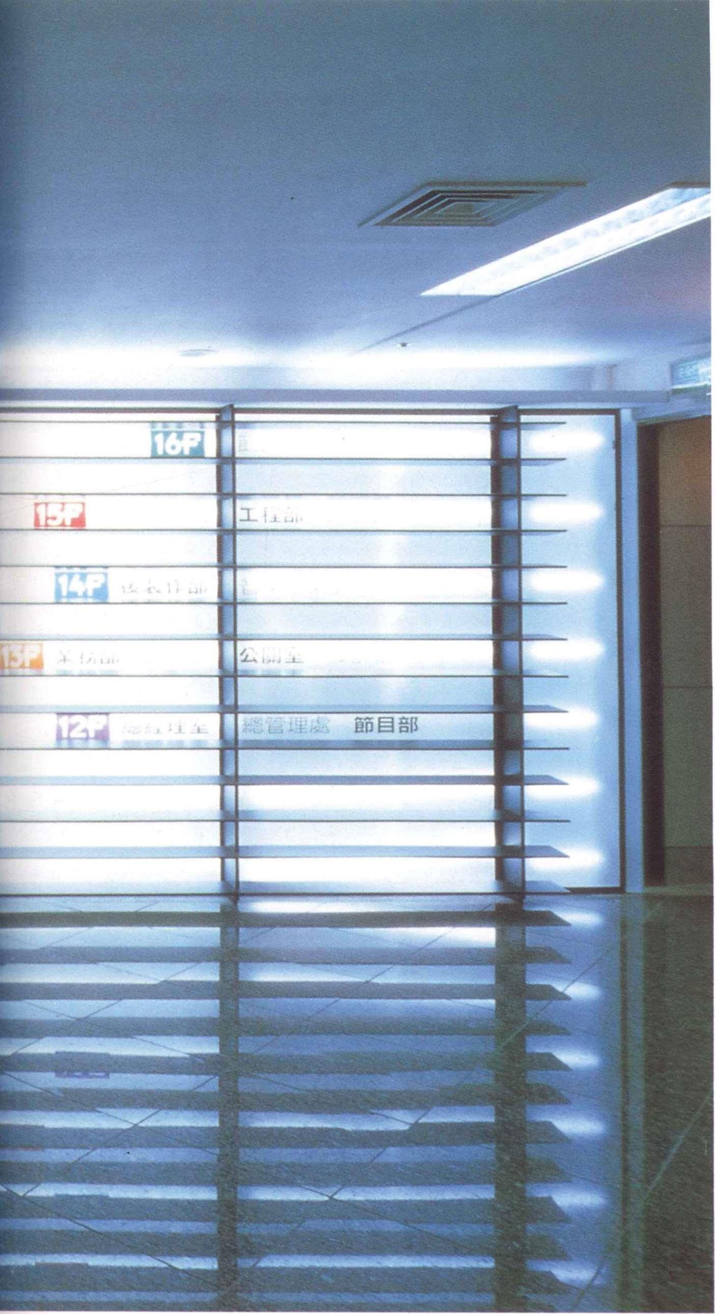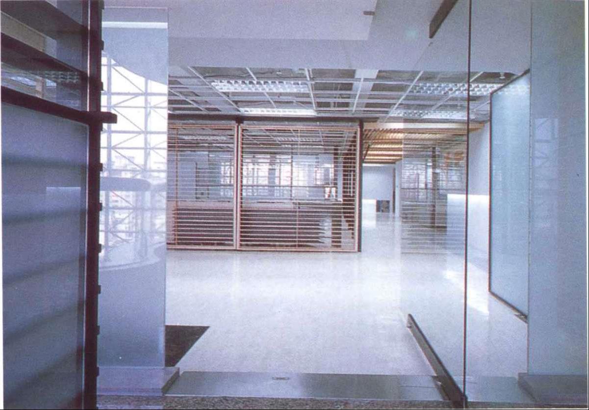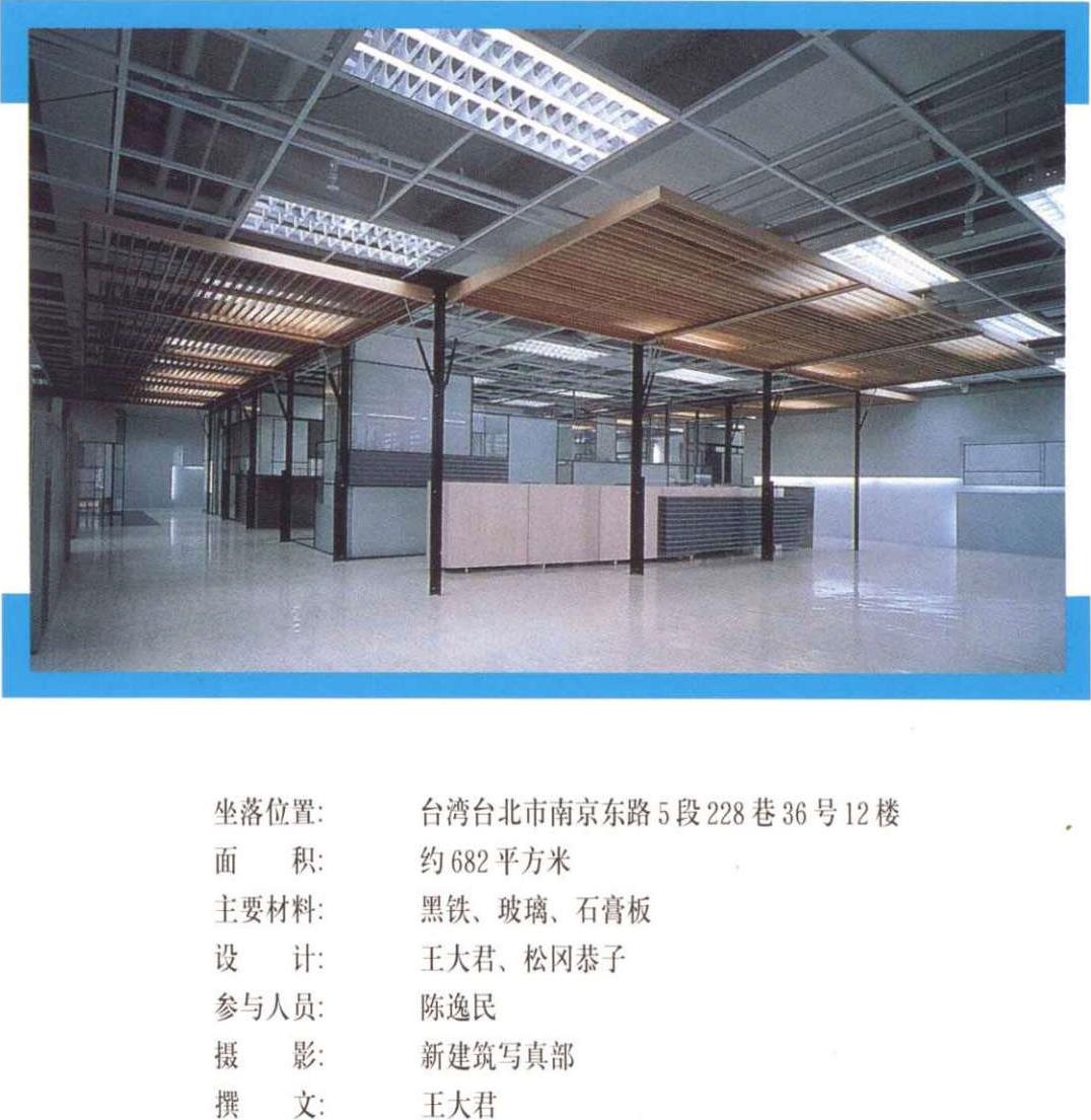 本案是5层办公室中的一层,是公司的中枢机能体,也是对外与内部的沟通场所。设计上设计师采开放式工作区,中心设置一个多重玻璃的沟通箱,其中包含柜台、会客室、会议室等,以及传真、电脑网路等电子通信式的沟通。细分割的玻璃,透明与半穿透的视觉手法将原有的层叠更加复杂,经由机能同时的使用,内部视觉干涉及箱子外围开放区人影的移动,反射映照在这个多向性的沟通体上。这个箱子的表面是一个可上开的羽板结构,扮演肢体介入这个多向性沟通空间的另一因子;经由这层“膜”的开闭组合,造成所谓的直接干涉与间接干涉。