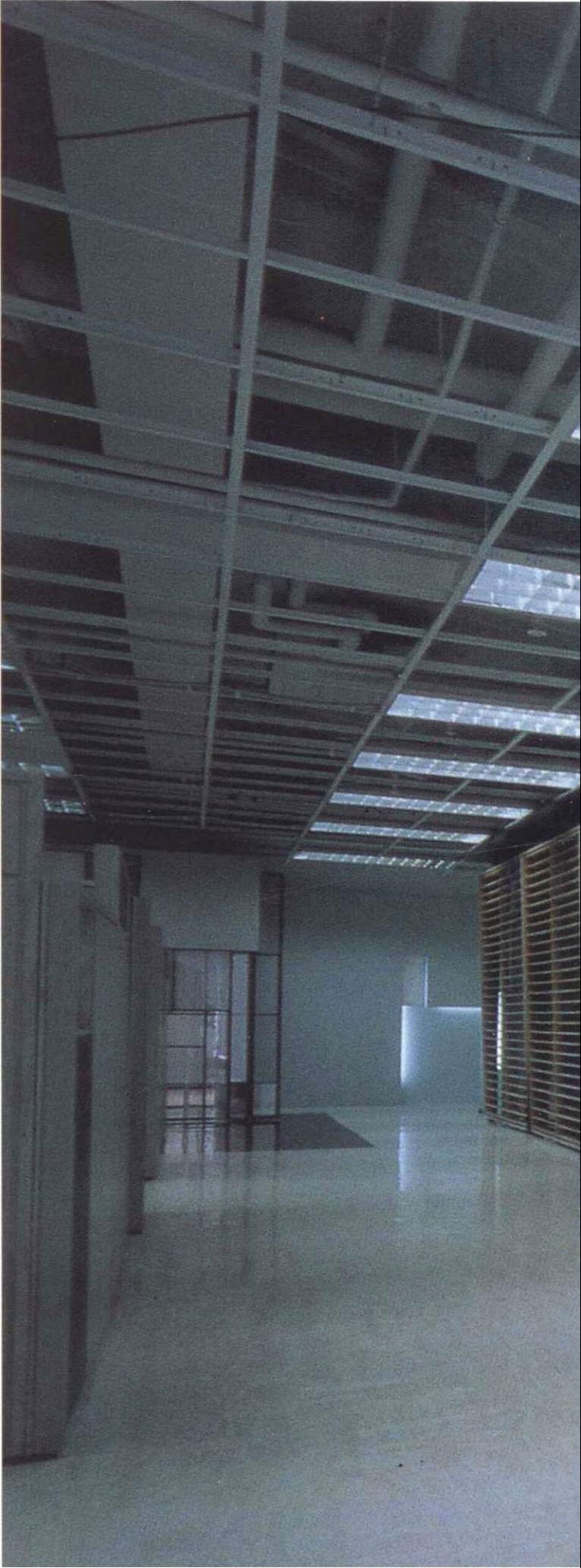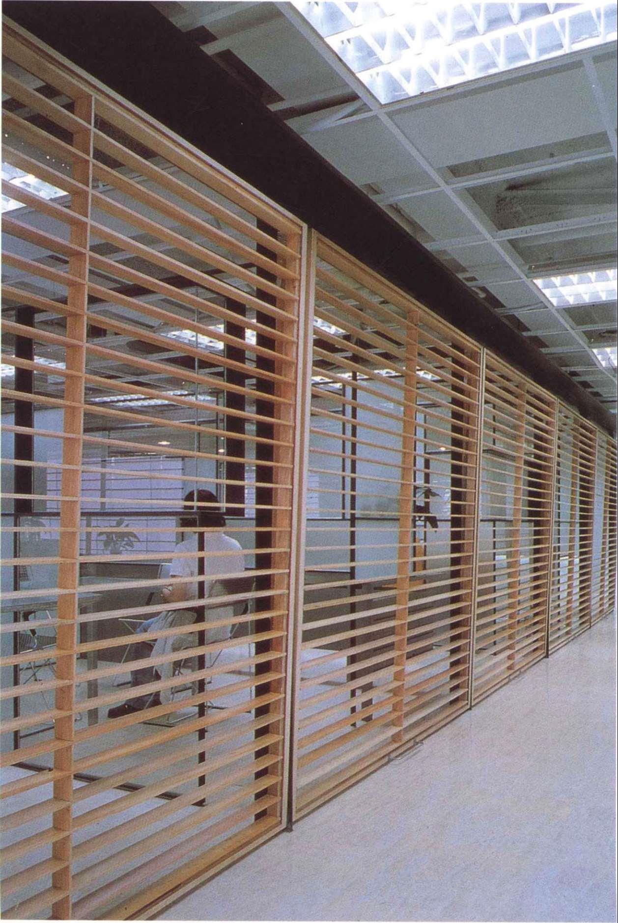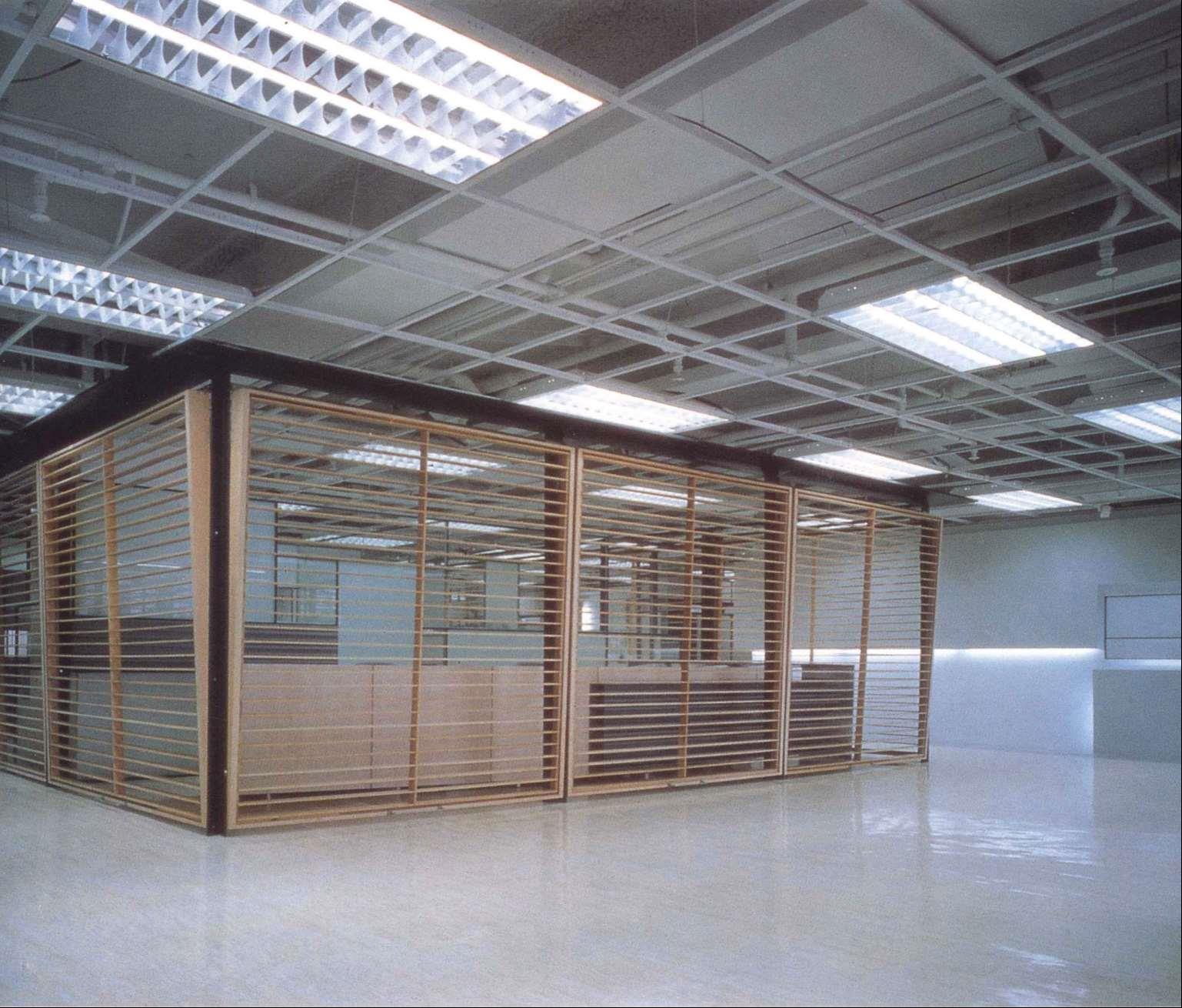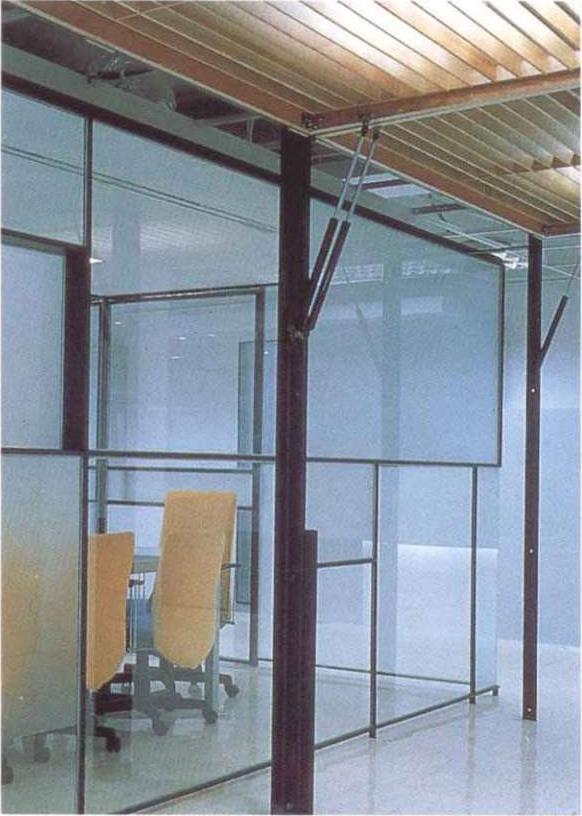 本案是5层办公室中的一层,是公司的中枢机能体,也是对外与内部的沟通场所。设计上设计师采开放式工作区,中心设置一个多重玻璃的沟通箱,其中包含柜台、会客室、会议室等,以及传真、电脑网路等电子通信式的沟通。细分割的玻璃,透明与半穿透的视觉手法将原有的层叠更加复杂,经由机能同时的使用,内部视觉干涉及箱子外围开放区人影的移动,反射映照在这个多向性的沟通体上。这个箱子的表面是一个可上开的羽板结构,扮演肢体介入这个多向性沟通空间的另一因子;经由这层“膜”的开闭组合,造成所谓的直接干涉与间接干涉。