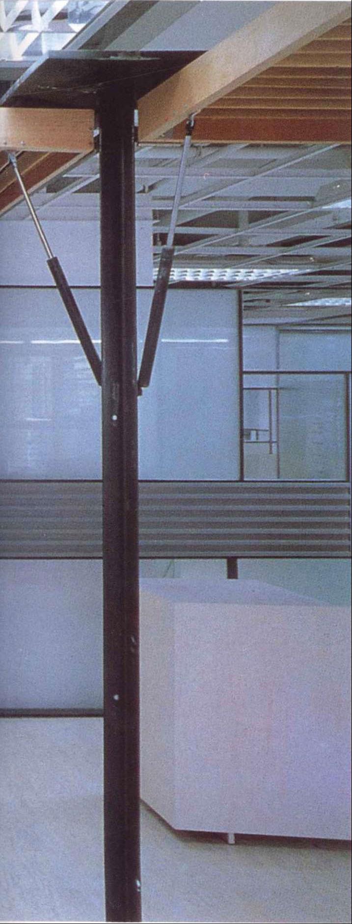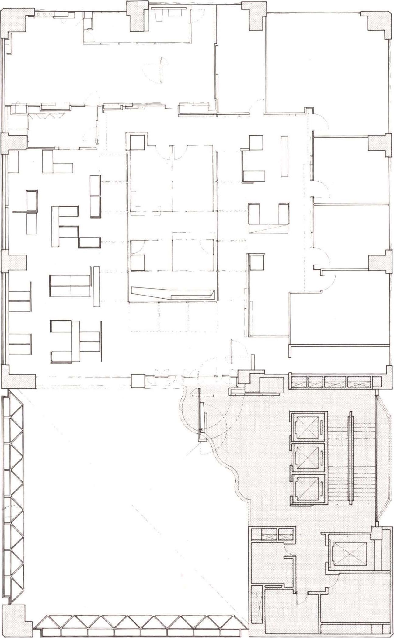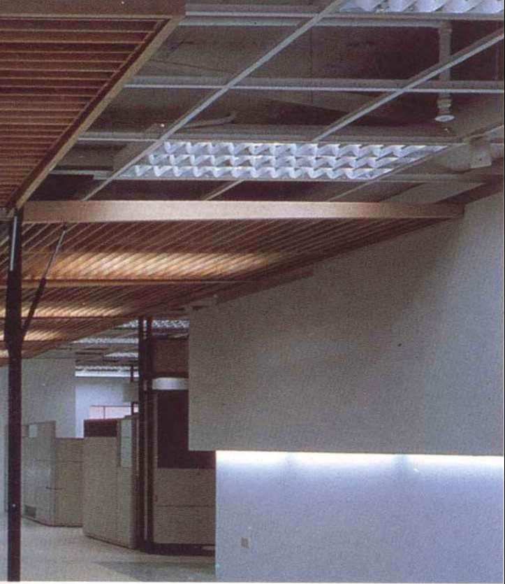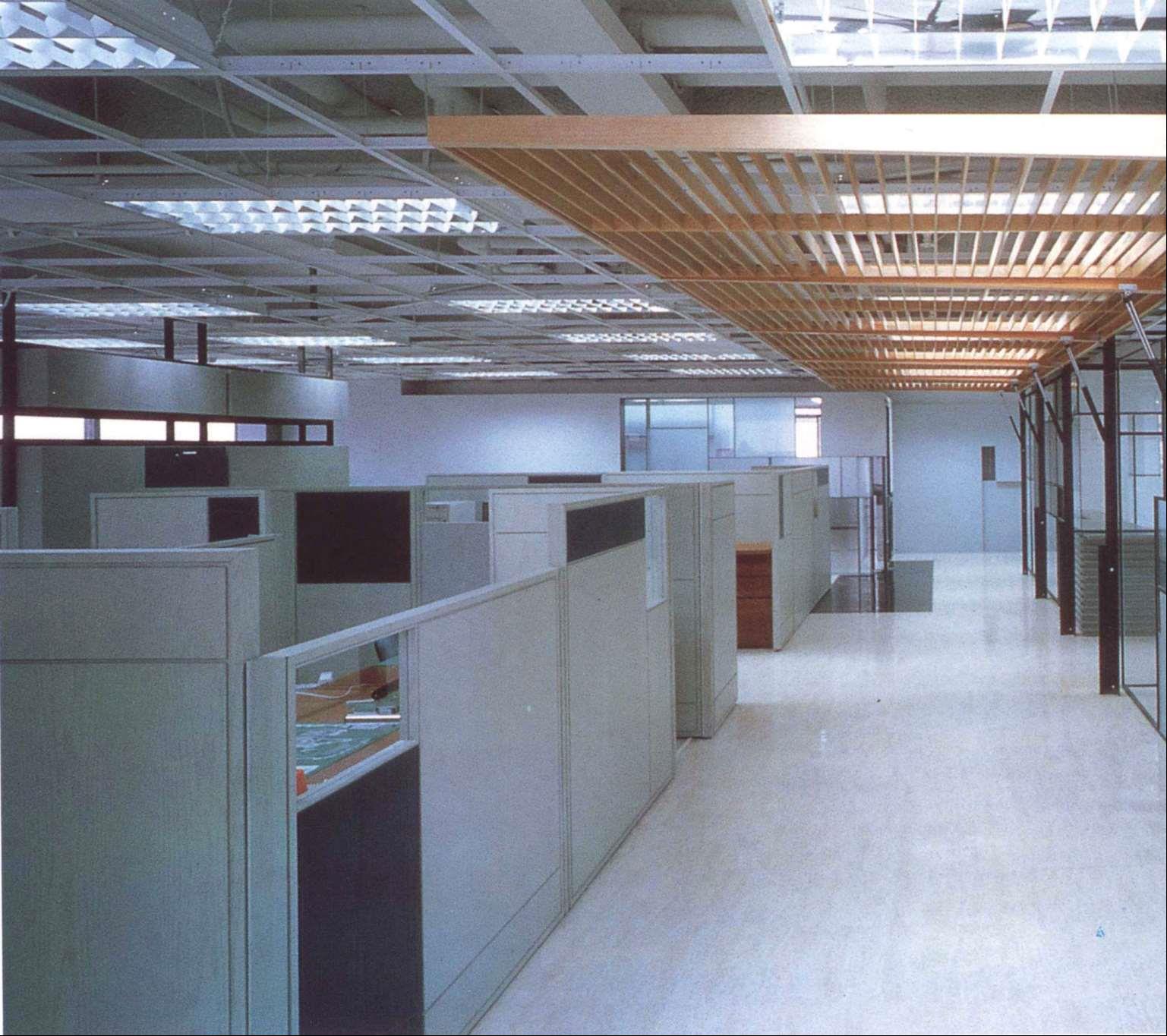 本案是5层办公室中的一层,是公司的中枢机能体,也是对外与内部的沟通场所。设计上设计师采开放式工作区,中心设置一个多重玻璃的沟通箱,其中包含柜台、会客室、会议室等,以及传真、电脑网路等电子通信式的沟通。细分割的玻璃,透明与半穿透的视觉手法将原有的层叠更加复杂,经由机能同时的使用,内部视觉干涉及箱子外围开放区人影的移动,反射映照在这个多向性的沟通体上。这个箱子的表面是一个可上开的羽板结构,扮演肢体介入这个多向性沟通空间的另一因子;经由这层“膜”的开闭组合,造成所谓的直接干涉与间接干涉。
