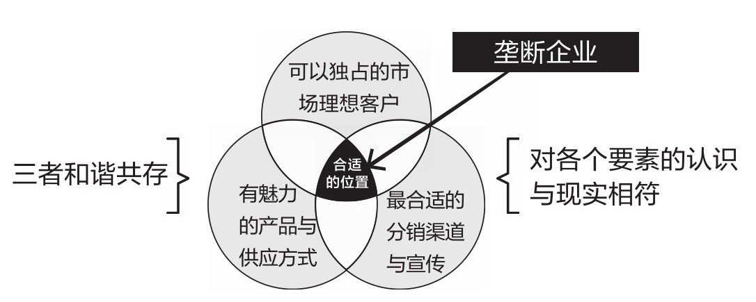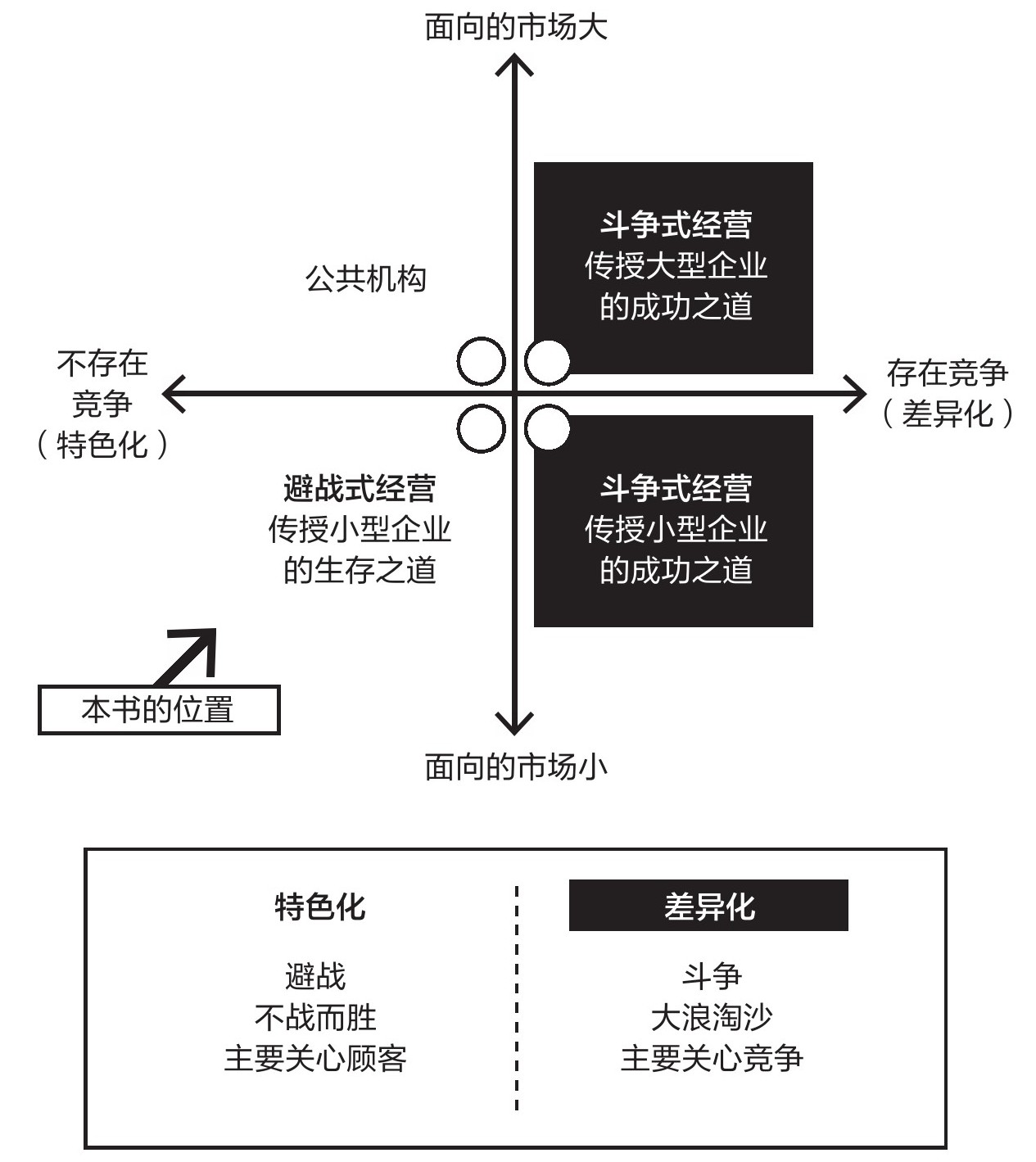 本书的行文以德鲁克的“生态利基战略”为基础。“生态利基战略”是一种“避战式经营”的战略,面向的是“小规模市场”。图1-1就是这一定位的可视化展示。