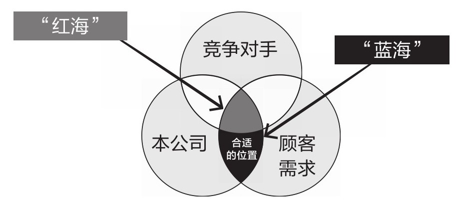 图1-3展示了市场、产品与供应方式、分销渠道与宣传这三大企业战略要素之间的关系。它们的关系与图1-2一致。图1-4展示了竞争市场与无竞争市场的关系。如果在某公司所处的市场中,除了自己以外还有很多其他企业也能满足顾客需求,那么该公司就身处一个竞争激烈的“红海”,即竞争市场。但反之, 如果公司是唯一能够满足顾客需求的企业,那么它就身处一个没有竞争的“蓝海”,即无竞争市场。