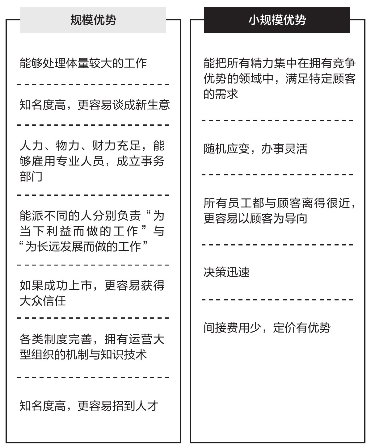 上述这些规模优势都是小型企业所不具备的。在处理体量较大的工作时,大型企业拥有小型企业无法抗衡的绝对力量与优势。因此, 小型企业决不能站在与大型企业正面竞争的位置上。