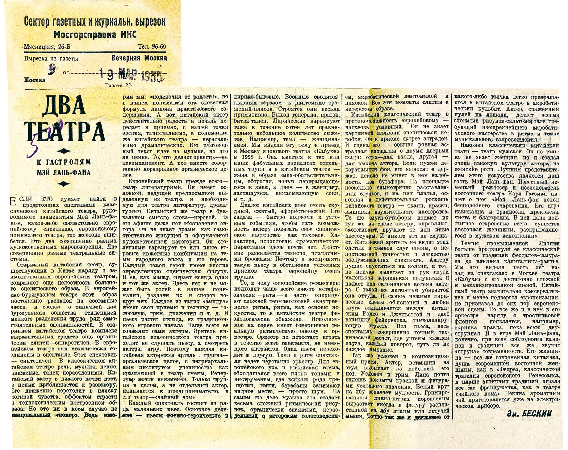 日本的工业化速度更多地把古典戏剧由封建武士道传统推向资本主义的影响之下——它是资本主义的获利者。六年前,我们在歌舞伎剧团于莫斯科的演出中看到了这一点。它有足够复杂的机械化舞台。中国戏剧显然比较保守且较少欧化,到现在欧洲式的舞台并没有得到他们的认可。并且乐队以竹笛为主,提琴只有两弦。在梅兰芳的表演中,当然,是在遵守程式和传统的情况下,仍然发出了现代之音。他扮演的女性,所有的都是现代的中国女性,有现代东方女性的灵魂,就像欧洲文艺复兴时期的经典悲剧《费德拉》,由法国人披着希腊的外衣饰演。同样,北京茶馆的剧场里芬芳四溢的茶已经是电器煮出的。