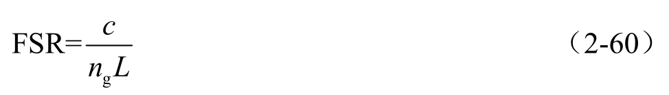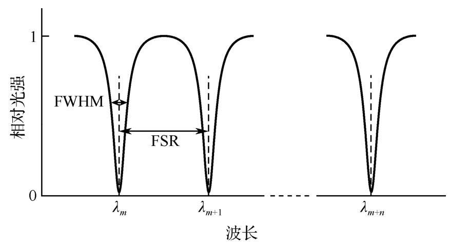 如图2-25所示,光学环形谐振腔具有谐振选频特性,其谐振模式呈周期性分布特征,相邻两个谐振模式之间的频率间隔称为自由光谱范围FSR。对于单个谐振模式,由于不同谐振腔的光波损耗程度不同,谐振模式宽度也不相同,因此通常利用谐振模式的半高全宽(FWHM)对其进行量化表征。