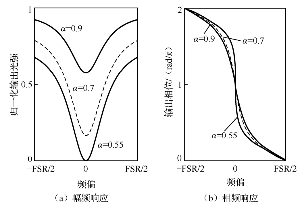 由于传输相移 φ 与入射光频率一一对应,根据式(2-46)和式(2-47)可以得到光学环形谐振腔的幅频与相频响应特性曲线。假设透射系数 ρ= 0.5,当腔内传输系数 α 分别为0.1、0.3和0.5时,相应的光学环形谐振腔的幅频与相频响应特性曲线分别如图2-20(a)和(b)所示,其中FSR为自由光谱范围。当 α<ρ 时,谐振腔处于欠耦合状态,腔内循环光占入射光总功率的比例较小。随着传输系数 α 增大,谐振腔传输幅频响应的最小值减小,而相频变化速率加快,但是谐振频率(频偏为0)处相位变化值始终为0。当 α = ρ =0.5时,谐振腔处于临界耦合状态,满足谐振条件的光波在腔内干涉相长,而输出端透射光相位变化值为π,与入射光干涉相消,因此输出光强达到最小值。