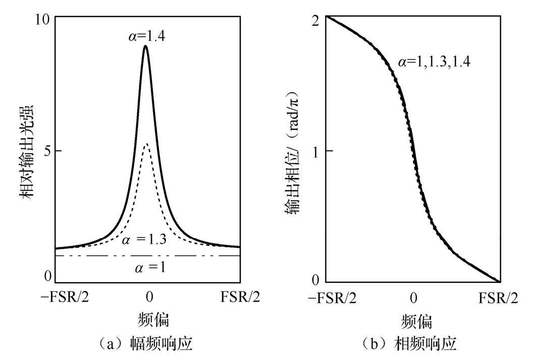 当 α =1时,光学环形谐振腔处于透明状态,输出光功率等于输入光功率,相当于不发生耦合过程;当 α> 1时,环形谐振腔处于选择性放大状态,其幅频和相频响应特性曲线分别如图2-22(a)和(b)所示,其中幅频响应特性曲线在谐振频率处存在增益峰值,随着传输系数 α 增大,增益逐渐升高,谐振频率处的相位变化速率加快。