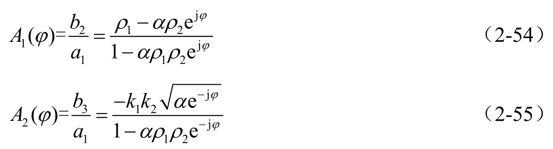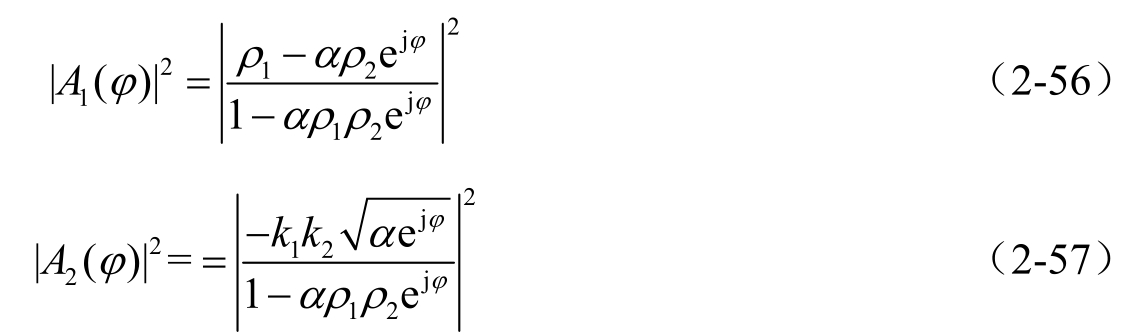 基于式(2-50)~式(2-53),上传/下载型光学环形谐振腔的直通端与下载端光场传递函数可以分别表示为