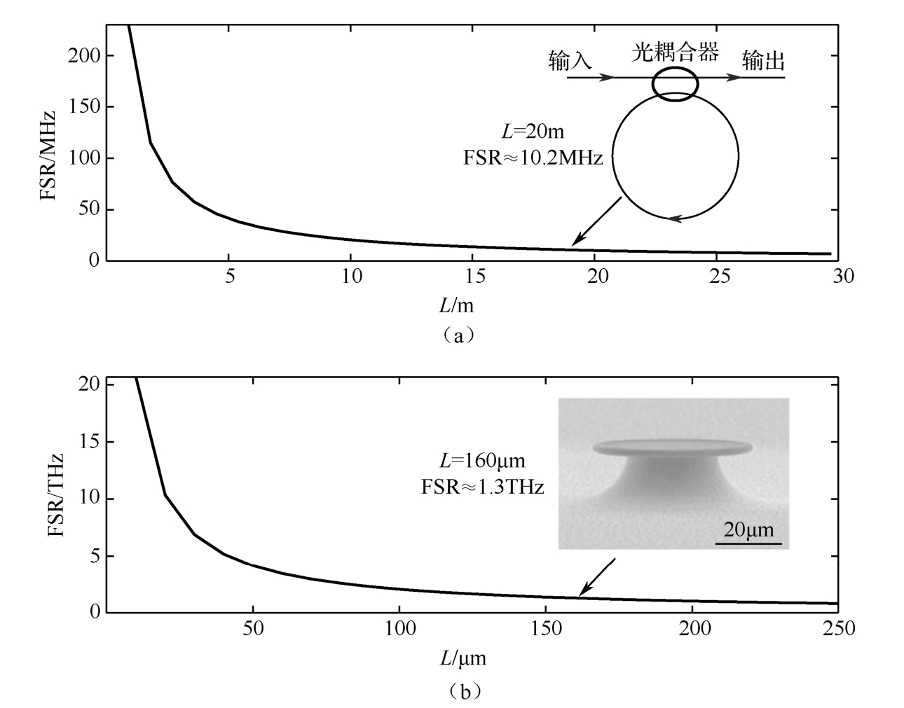 图2-26 光纤环形谐振腔(a)和二氧化硅微盘腔(b)的自由光谱范围FSR与腔长 L 之间的关系曲线