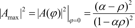 通过改变传输系数 α 与透射系数 ρ ,光学环形谐振腔将处于不同的工作状态,如图2-19所示。根据腔内介质材料损耗与增益系数的相对大小关系,光学环形谐振腔可以作为无源、有源和透明器件使用。当谐振腔由无源介质构成(即仅存在内部损耗且 α< 1)时,根据传输系数 α 与透射系数 ρ 之间的关系,光学环形谐振腔分别处于欠耦合( α<ρ )、过耦合( α>ρ )和临界耦合( α=ρ )状态;当腔内损耗与有源介质增益平衡( α =1)时,谐振腔输出光强与入射光强相等,此时谐振腔处于透明状态;当腔内有源增益大于本征损耗( α> 1)时,光学环形谐振腔将处于选择性放大状态,整体上可以视为光学放大器。为了避免系统自激振荡, α 通常小于起振阈值 α th =1/ ρ 。