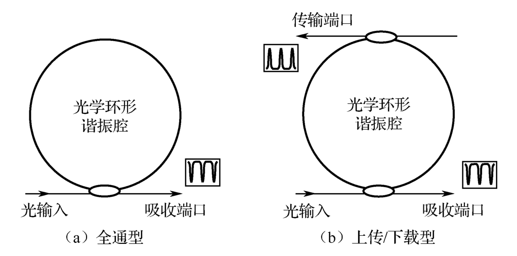 微波光电振荡器中的高品质光学谐振腔通常采用环形结构,光纤环形谐振腔和回音壁模式光学微腔是其中最常用的两种类型。在实际应用中,根据耦合波导个数,光学环形谐振腔可以分为全通(All-pass)型和上传/下载(Add-drop)型两种典型结构,分别如图2-17(a)和(b)所示。通过构建统一模型可以得到两类光学环形谐振腔的传输响应,并进一步分析光学环形谐振腔基本参数对其品质因数等性能指标的影响。
