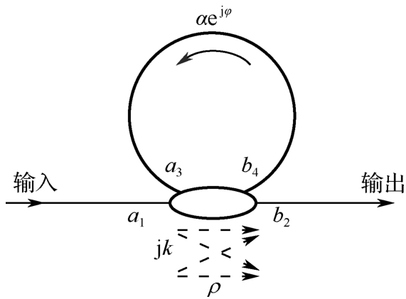 全通型光学环形谐振腔的传输模型如图2-18所示,其中包含四个基本参数:透射(直通耦合)系数 ρ∈ [0,1]、交叉耦合系数 k∈ [0,1]、腔内光场传输系数(简称传输系数) α 和传输相移 φ 。 a 1 、 a 3 、 b 2 和 b 4 定义为各耦合端口处光场复振幅,其模值的平方对应相应端口的光功率。假设耦合进谐振腔的光波单向传输且为线偏振态,耦合端口处无额外损耗,即
