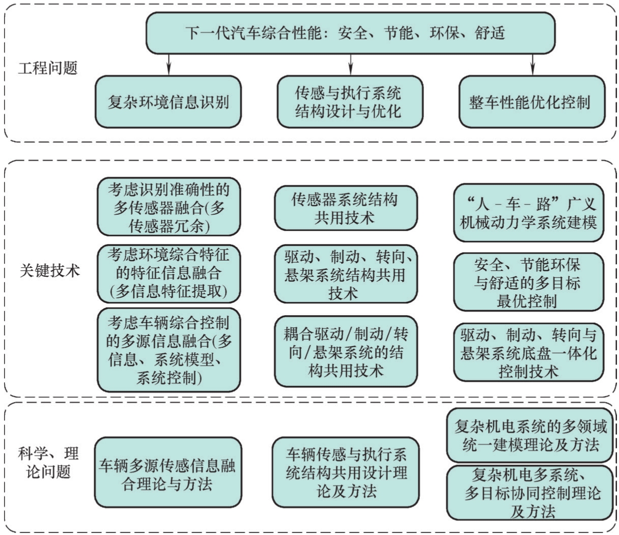 要实现i-EFV安全、节能、环保、舒适的行驶目标,需要解决其传感与执行等复杂机电系统的结构设计与优化、运行过程中复杂环境信息识别和整车性能优化控制等重点工程问题,这需要依赖结构共用、信息融合与控制协同三大关键技术的支撑。而这三大关键技术的开发,则需要探索和解决i-EFV“人-车-路”广义机械动力学系统中多物理过程及多系统耦合的复杂系统动力学行为产生机理、复杂机电系统多系统、多目标协同控制理论和车辆传感与执行系统结构共用设计理论、车辆多源传感信息融合理论等多学科交叉融合的基础科学问题。i-EFV的基础理论与关键技术体系架构如图2.8所示。