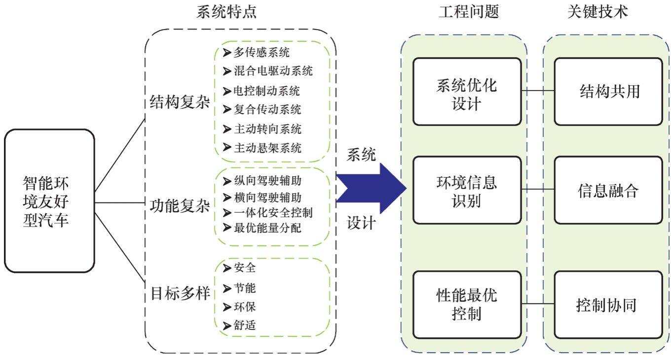 智能环境友好型车辆系统包括多传感系统、混合电驱动系统、电控制动系统、复合传动系统、主动转向系统和主动悬架系统,以实现包括纵、横向驾驶辅助,一体化安全控制以及最优能量分配等功能,并最终达到安全舒适与节能环保的综合目标。相比于现有的智能汽车与新能源汽车,智能环境友好型车辆具有结构复杂、功能复杂和目标多样的系统特点。针对i-EFV所涉及的系统结构复杂、识别信息多样、控制系统耦合等难点问题,提出结构共用、信息融合与控制协同的i-EFV三大关键技术。其中,结构共用解决i-EFV复杂系统结构集成、优化及其功能安全的硬件设计问题,信息融合处理“人-车-路”复杂信息识别及预测的信号处理问题,控制协同解决安全、舒适、节能与环保多目标协调,纵向、横向驾驶辅助、一体化安全控制等多行驶模式协调以及复杂“机-电-液”耦合多系统动态协调的综合控制问题,如图2.6所示。