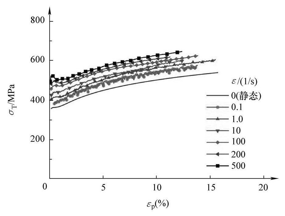 汽车碰撞过程是一个瞬时的动态过程,在典型的汽车正面碰撞测试中车身材料的变形应变率可达500/s甚至更高。与准静态过程相比,动态过程中材料的力学特性有所不同,称为材料的应变率效应。钢铁材料一般均存在应变率效应,提高应变率一般会使其变形抗力提高。图4-1是一种低合金高强度冷轧钢 HC340LA在不同应变率下的真实应力-真实应变曲线,随着应变率从静态增加到500/s,真实应力增大了20%以上。研究车身材料的动态力学行为,尤其是在大变形场景下,对于车身安全设计中材料的合理选择和分布设计具有重要的指导意义。