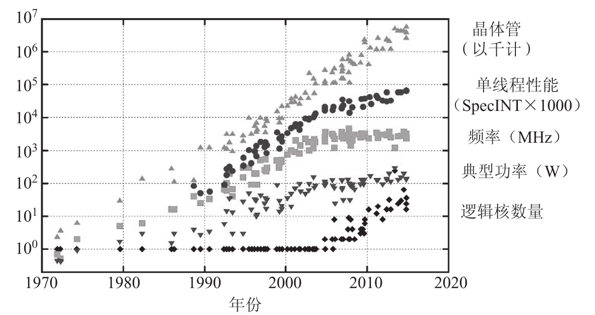 图1 微处理器40年趋势数据(©图片来自K.Rupp的karlrupp.net网站)