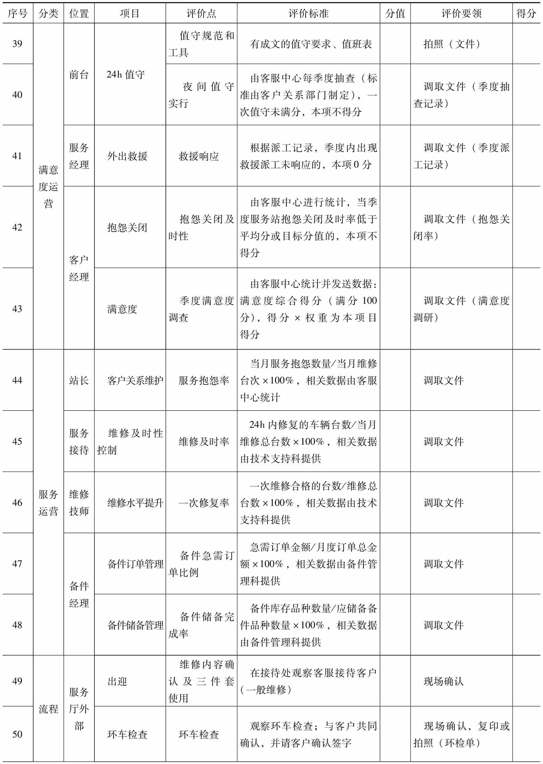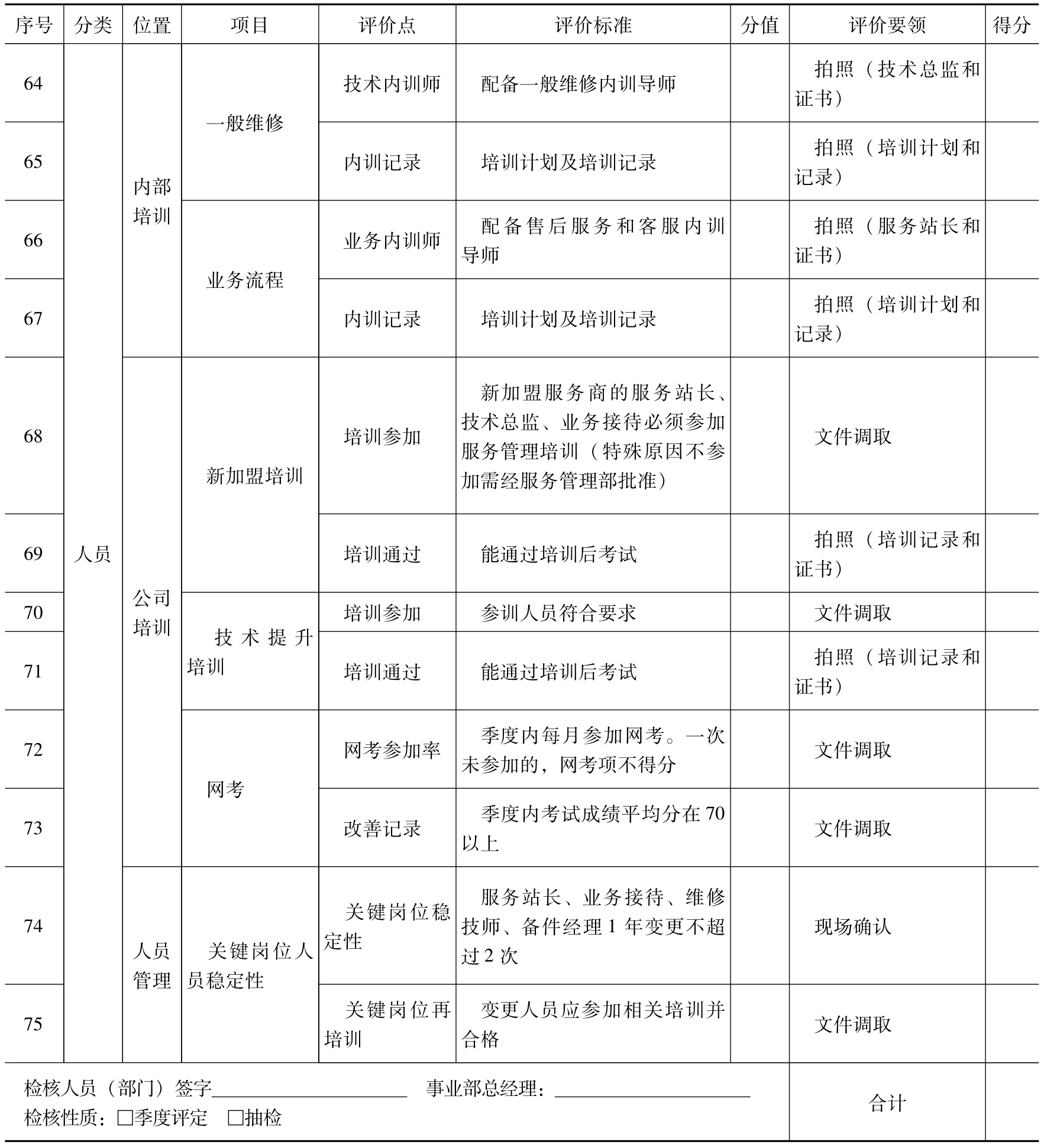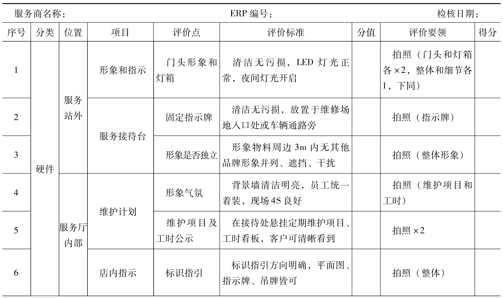 评价点:业务要素的具体标准,根据服务站实际状况与标准的吻合情况,判断是否得分(或分值)。