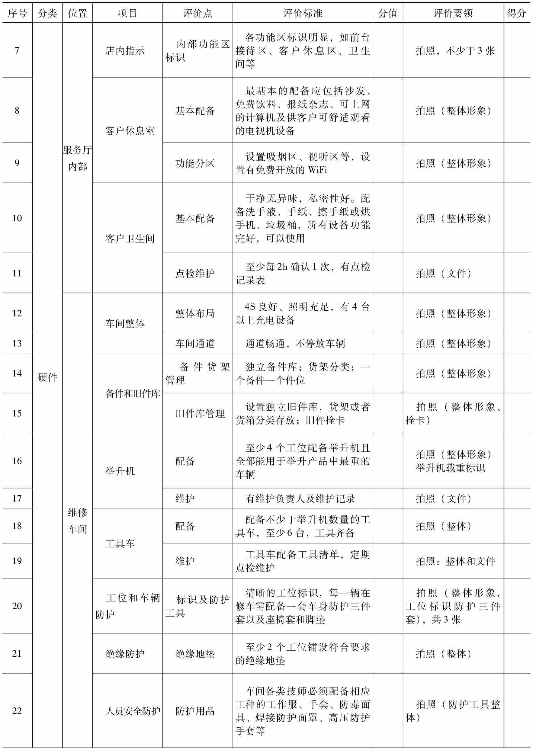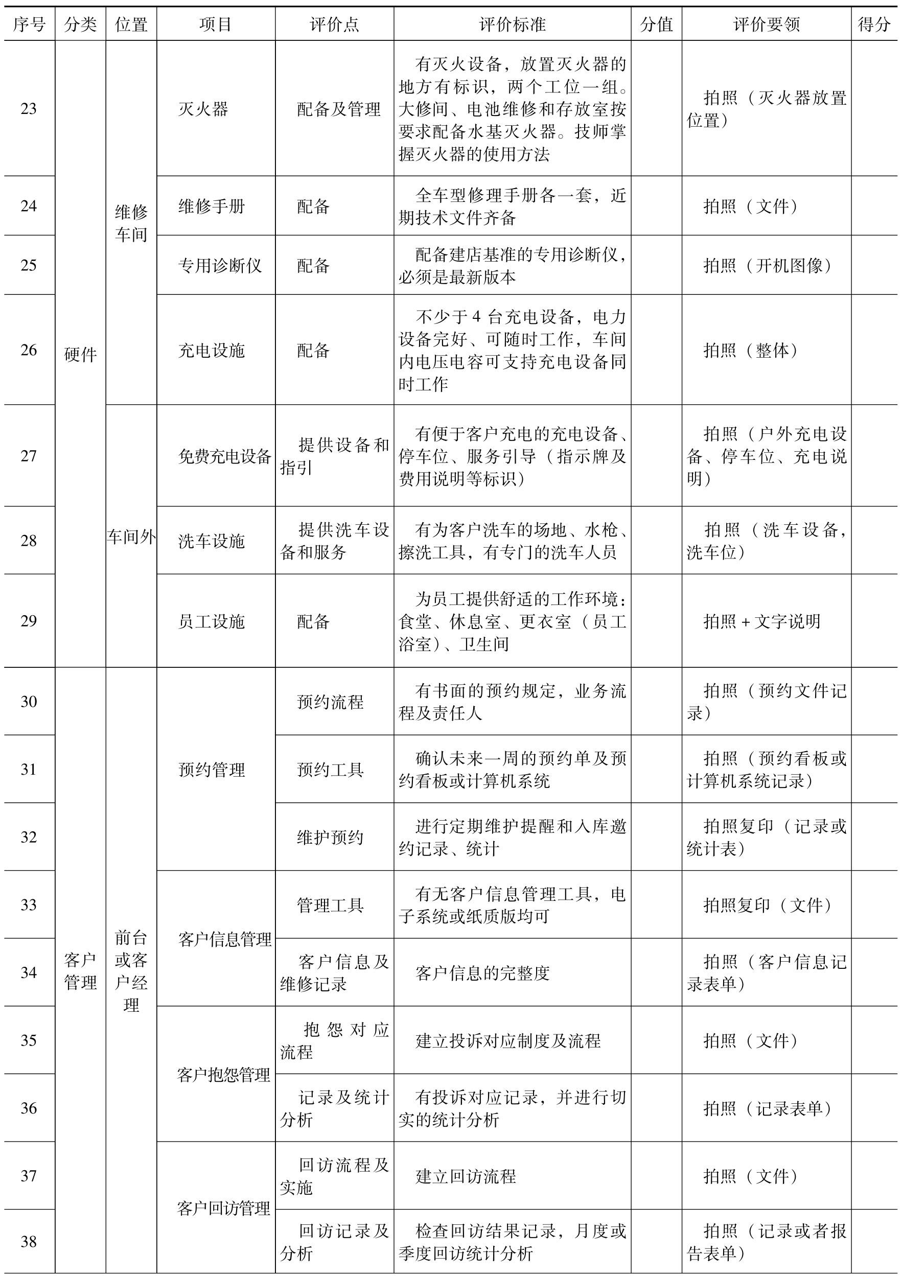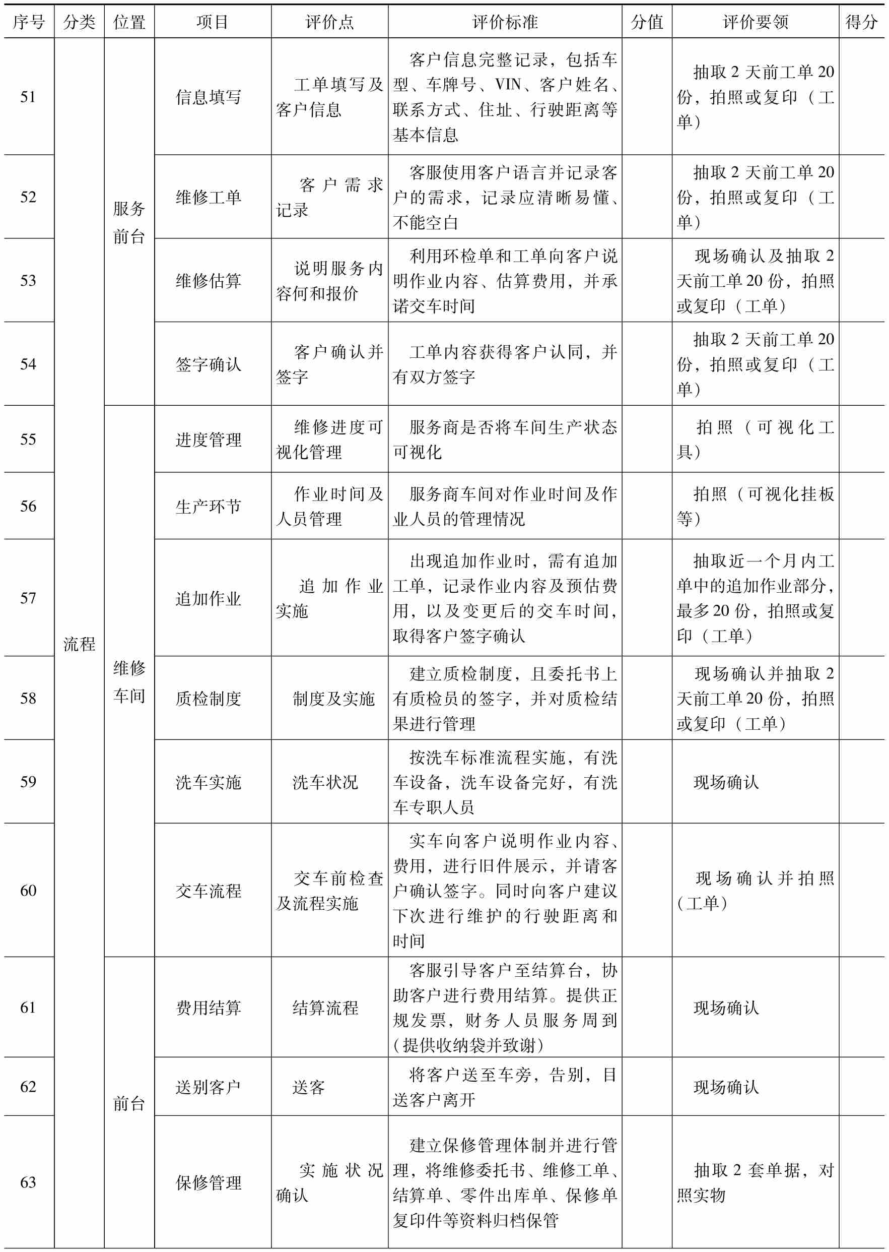 评价点:业务要素的具体标准,根据服务站实际状况与标准的吻合情况,判断是否得分(或分值)。