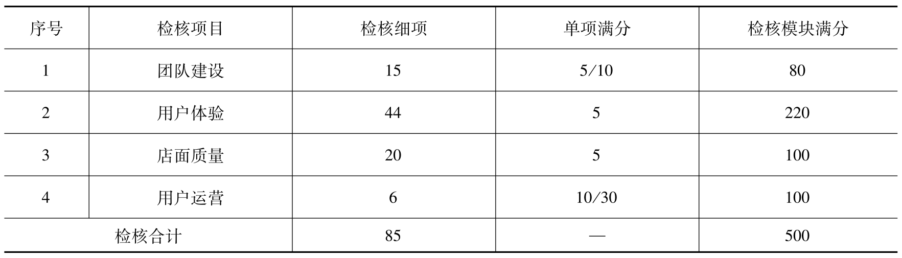 某汽车服务商运营评价指标分为:团队建设、用户体验、店面质量、用户运营四个维度,评价项目共计85项,总分500分,见表1-3,这是在2021年检核项目基础上进行的优化升级,实现了用户中心、体验中心、体验空间的高度整合,标准运营检核以季度为单位对城市合伙人及直营店进行评分,并根据得分排名进行差异化的运营返利兑现。