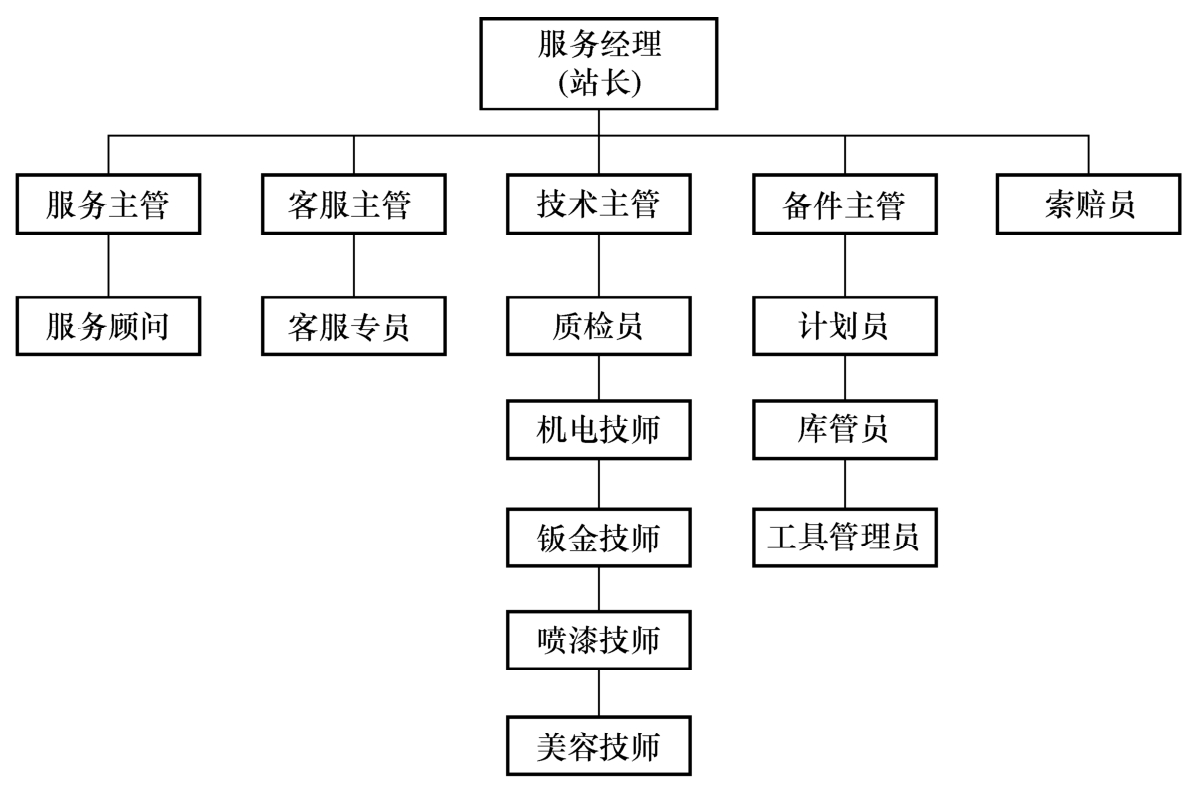 新能源汽车服务企业的组织机构同样是为经营服务的,组织机构的设置与选择哪些经营项目密切相关,但其一定要以客户为中心,高效且要有较强的服务意识,特别是要抓住新能源汽车自身的特点和用户群的类型进行组织机构的设置。图2-4是北汽新能源服务站人员组织机构,主要是对岗位的设置。