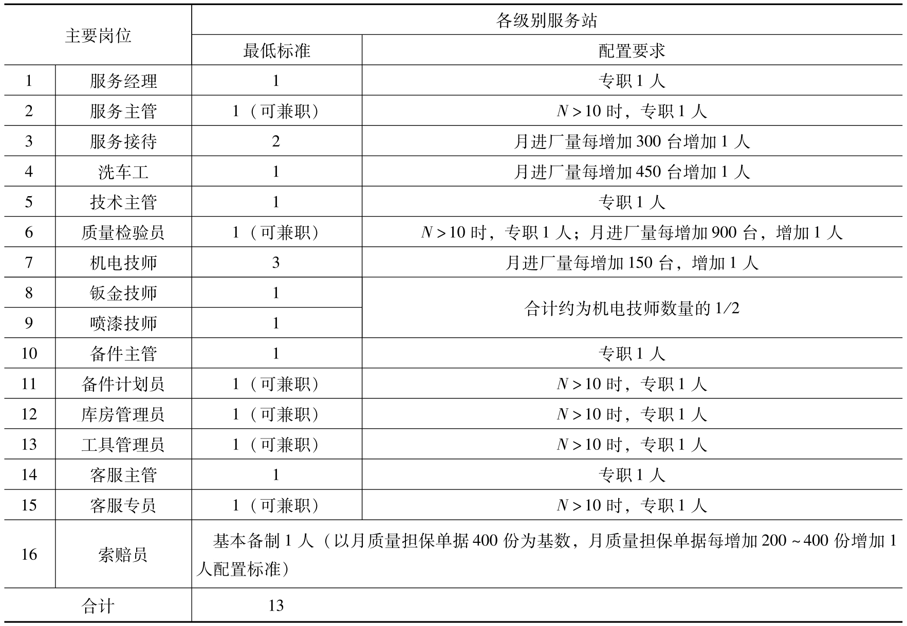 表2-2 北汽新能源服务站人员配置标准