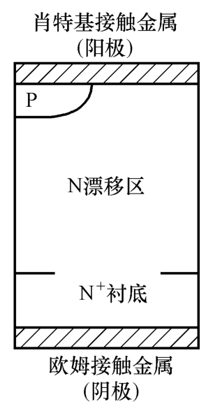 单极型功率二极管为肖特基整流二极管,利用金属-半导体势垒实现整流。功率肖特基二极管的结构还包含漂移区,如图1.4所示。由于漂移区的电阻随着反向电压的增加而迅速增加,所以商用的硅肖特基二极管的阻断电压一般在100V以下。对于实际应用而言,当超过该值时,硅肖特基二极管的通态压降变大。对于硅PiN二极管,尽管其开关速度较慢,但其通态压降低,可以用来设计具有较大击穿电压的器件。