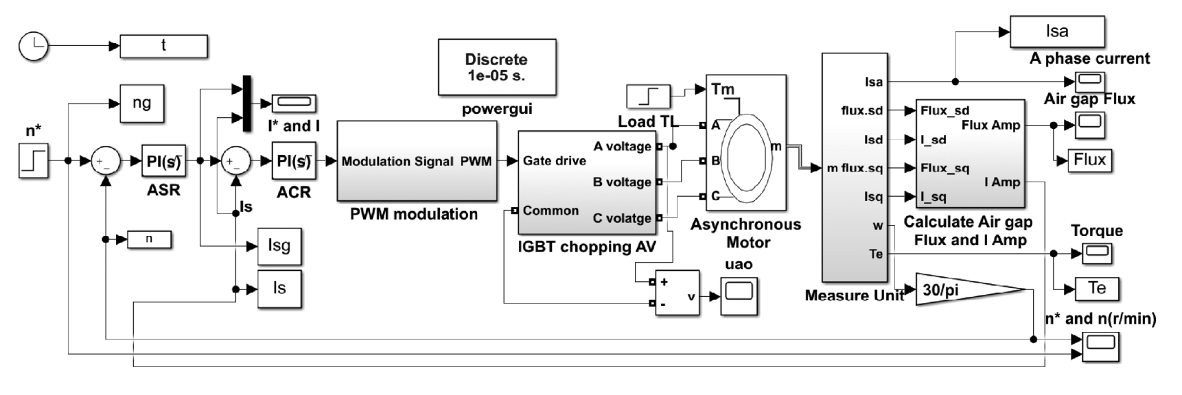 根据转速给定 n * 及转速反馈 n 计算转速误差 n * -n ;把转速误差 n * -n 送给转速调节器ASR输出定子电流幅值给定值 I sg ,其中ASR中比例系数和积分系数分别为25、0.3,输出限幅值为17.79A;根据定子电流幅值给定值 I sg 及定子电流幅值反馈值 I s (即I_Amp)计算定子电流幅值控制误差 I sg -I s ;把定子电流幅值控制误差 I sg -I s 送给电流调节器ACR,输出瞬时调制信号,其中ACR比例和积分系数分别为65、6,输出调制信号限幅在-1~+1;瞬时调制信号送给PWM调制模块“PWM modulation”,实现瞬时调制信号与幅值为1、频率为20kHz的正极性三角波进行比较,输出PWM驱动信号送给IGBT斩控式调压模块“IGBT chopping AV”,输出经过脉冲宽度调制的三相变压交流电压给异步电机模块“Asynchronous Motor”。
