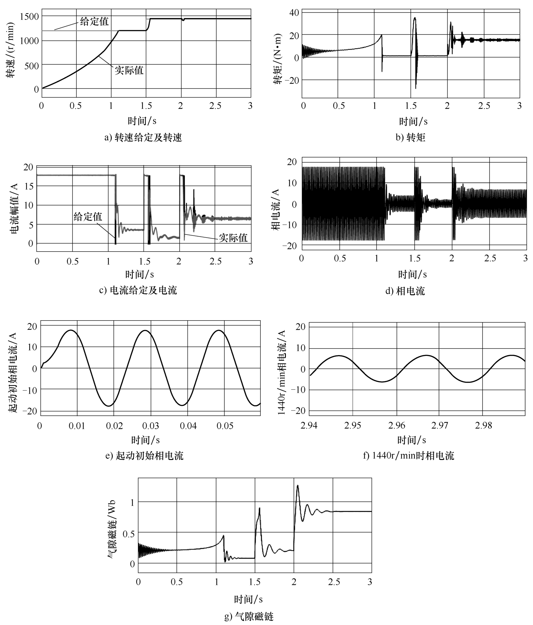 电机轻载1N·m由零转速起动至1200r/min,在1.5s处升速至额定转速1440r/min,在2s处负载突增至额定值15N·m仿真波形如图3-14所示。从仿真结果可见:①采用调压调速电机转速能够由零转速上升至给定值1200r/min,在此过程中定子电流幅值能够限制在最大限幅值;②即使起动阶段定子电流幅值被限制在最大值,但由于没有直接控制定子电流有功分量,导致启动阶段的转矩并不恒定,从而无法保证转速线性快速上升;③转速和电磁转矩能够跟随外界的给定变化而变化;④由于采用了定子电压幅值调节速度,而定子供电频率不变,所以从相绕组电流启动阶段和1440r/min高速稳定阶段电流波形比较可见相电流频率恒等于50Hz;⑤由于定子供电频率保持为50Hz不变,仅仅靠调压调速,所以电机低速气隙磁链幅值小,且随转速的提高,气隙磁链幅值随之增大,气隙磁链幅值不可控制。