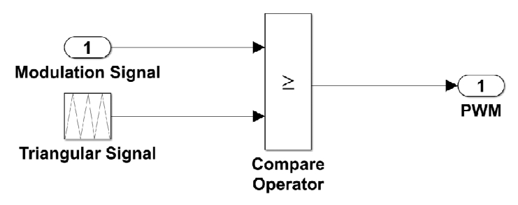 PWM调制模块“PWM modulation”内部逻辑如图3-11所示,瞬时调制信号“Modulation Signal”与三角波“Triangular Signal”经过比较器“Compare Operator”后,输出PWM控制加到电机绕组上的交流电压幅值。